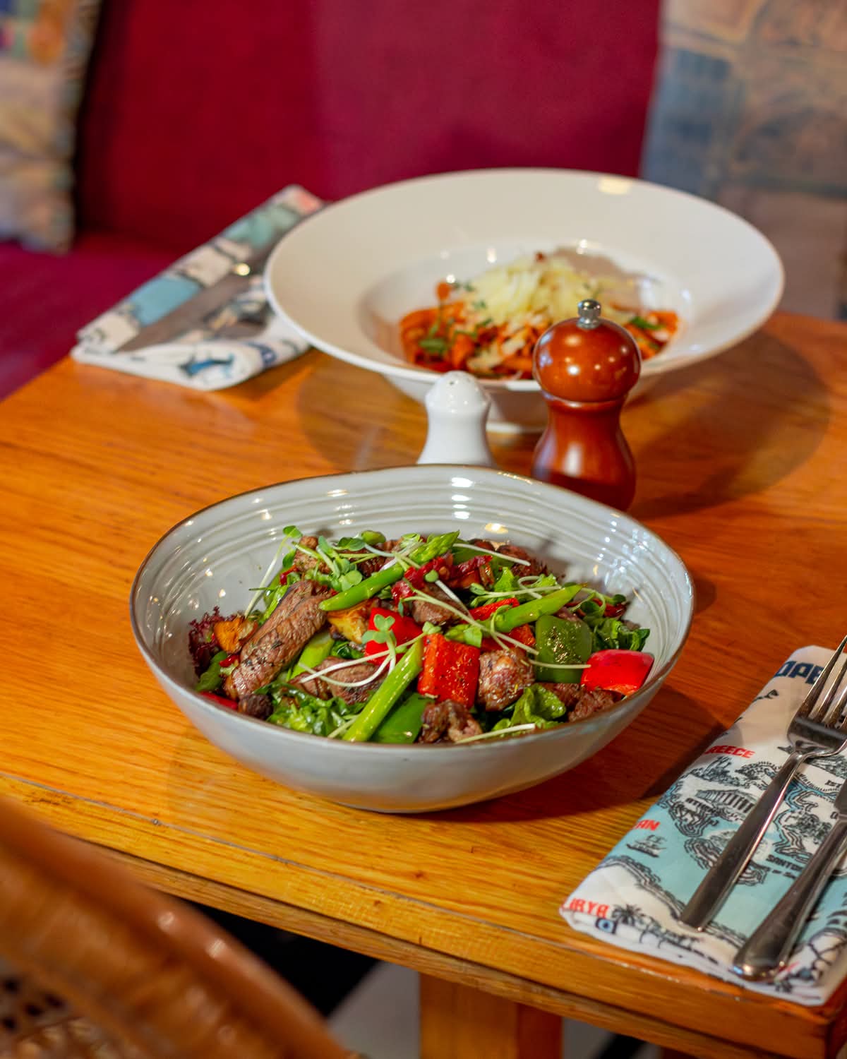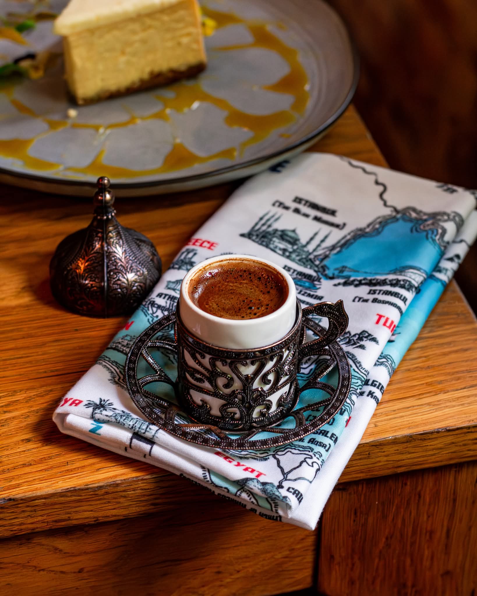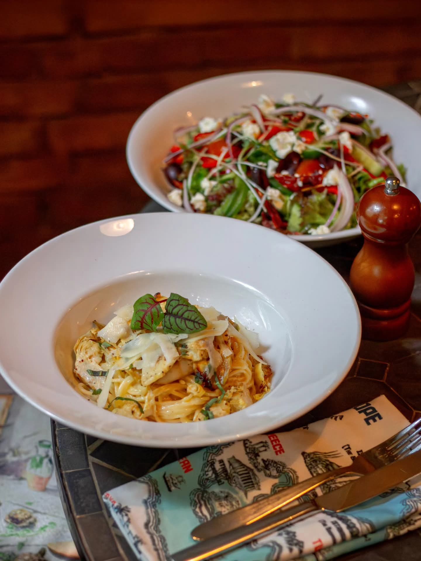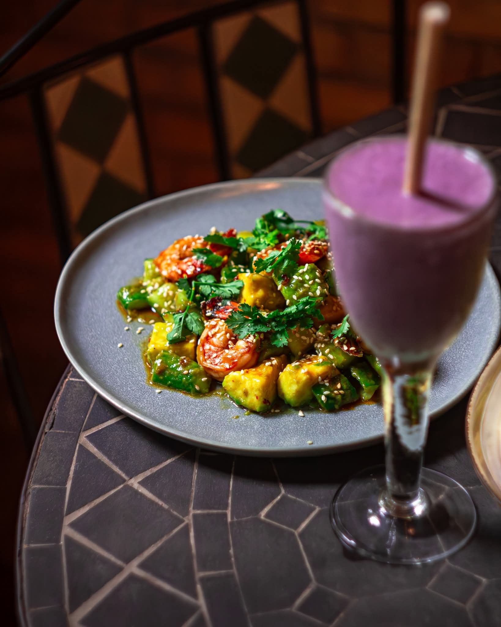 Thực đơn nhà hàng là sự kết hợp tinh tế của ẩm thực Địa Trung Hải và Trung Đông với đa dạng các món ăn từ Tây Ban Nha, Pháp, Ý, Thổ Nhĩ Kỳ, Síp, Li-băng, Syria, Israel, đến Ai Cập, Tunisia, Algeria, Maroc, Hy Lạp... Nét đặc trưng của ẩm thực Địa Trung Hải đó là sự ưu tiên nguyên liệu thực vật tươi, đặc biệt là rau củ, trái cây, các loại đậu và ngũ cốc nguyên hạt, sử dụng dầu ô liu làm chất béo chính và hải sản tươi thay vì thịt đỏ.