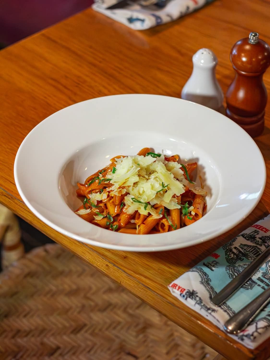 - Penne Alla Vodka Pasta đậm đà trong từng ống mì với phần sốt cà chua kem mịn hoà quyện cùng phô mai Parmesan béo ngậy.