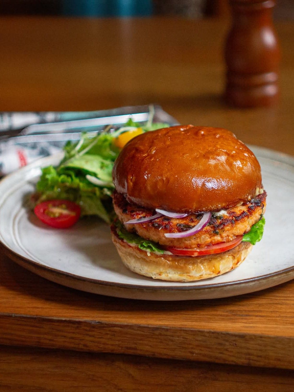 - Burger Cá Hồi với phần nhân cá hồi mọng nước, tươi ngon và giàu Omega-3 được nêm nếm hoàn hảo, đi kèm với sốt mayonnaise gừng wasabi đậm đà, mang đến vị cay nồng thú vị mà không gây cảm giác nặng nề. Món bánh còn đi kèm với xà lách rocket giòn tan và cà chua tươi cùng hành tím thái mỏng, mang lại sự cân bằng tuyệt vời từ vitamin và chất xơ bổ sung.