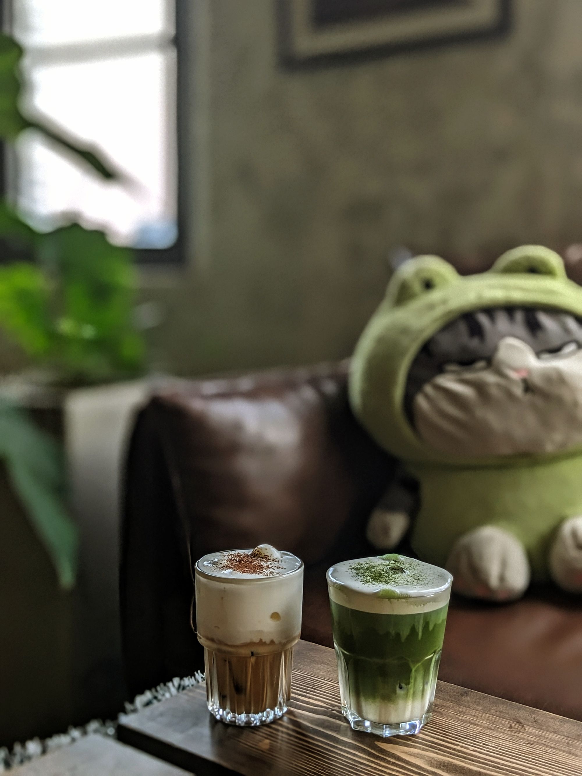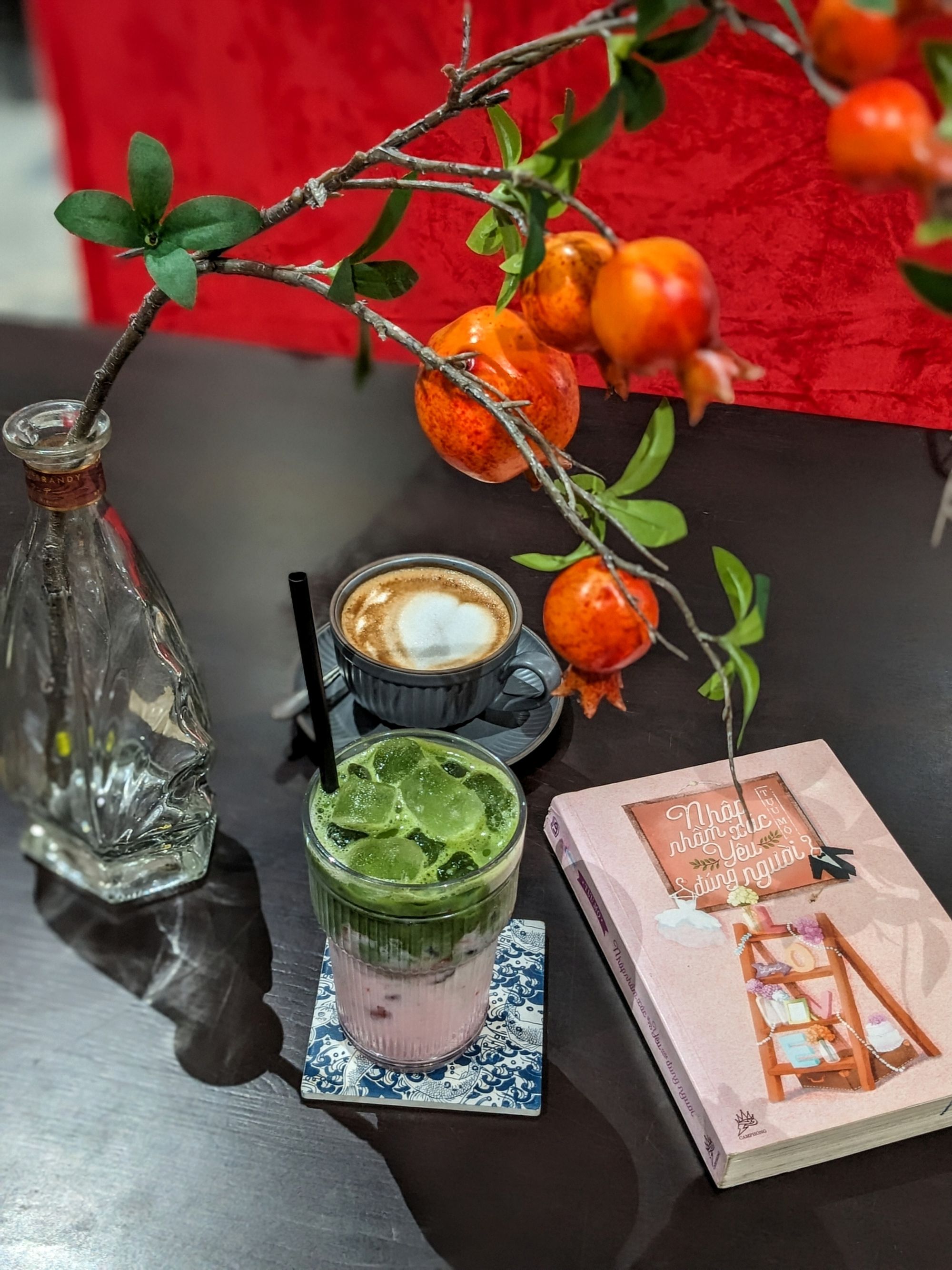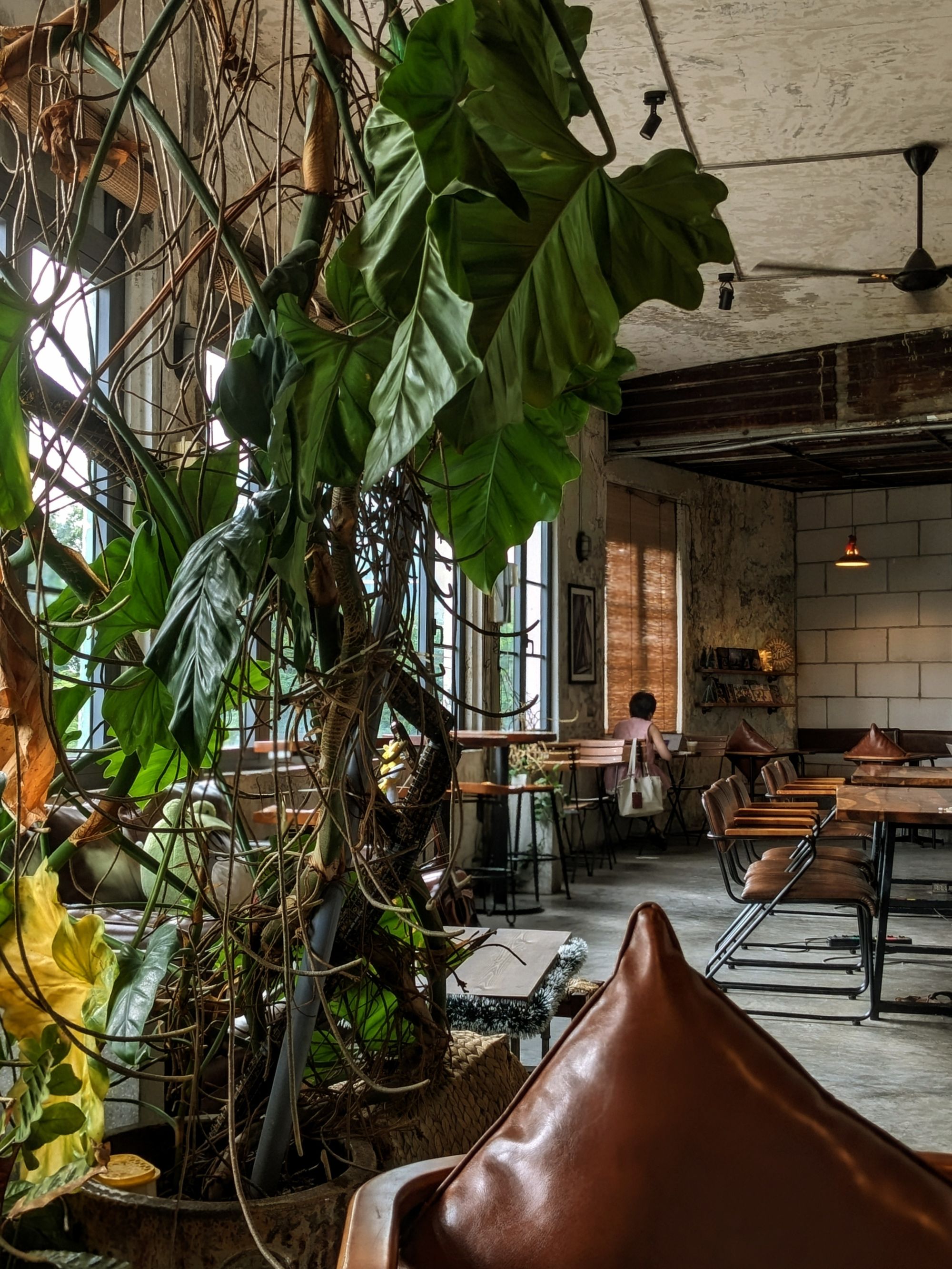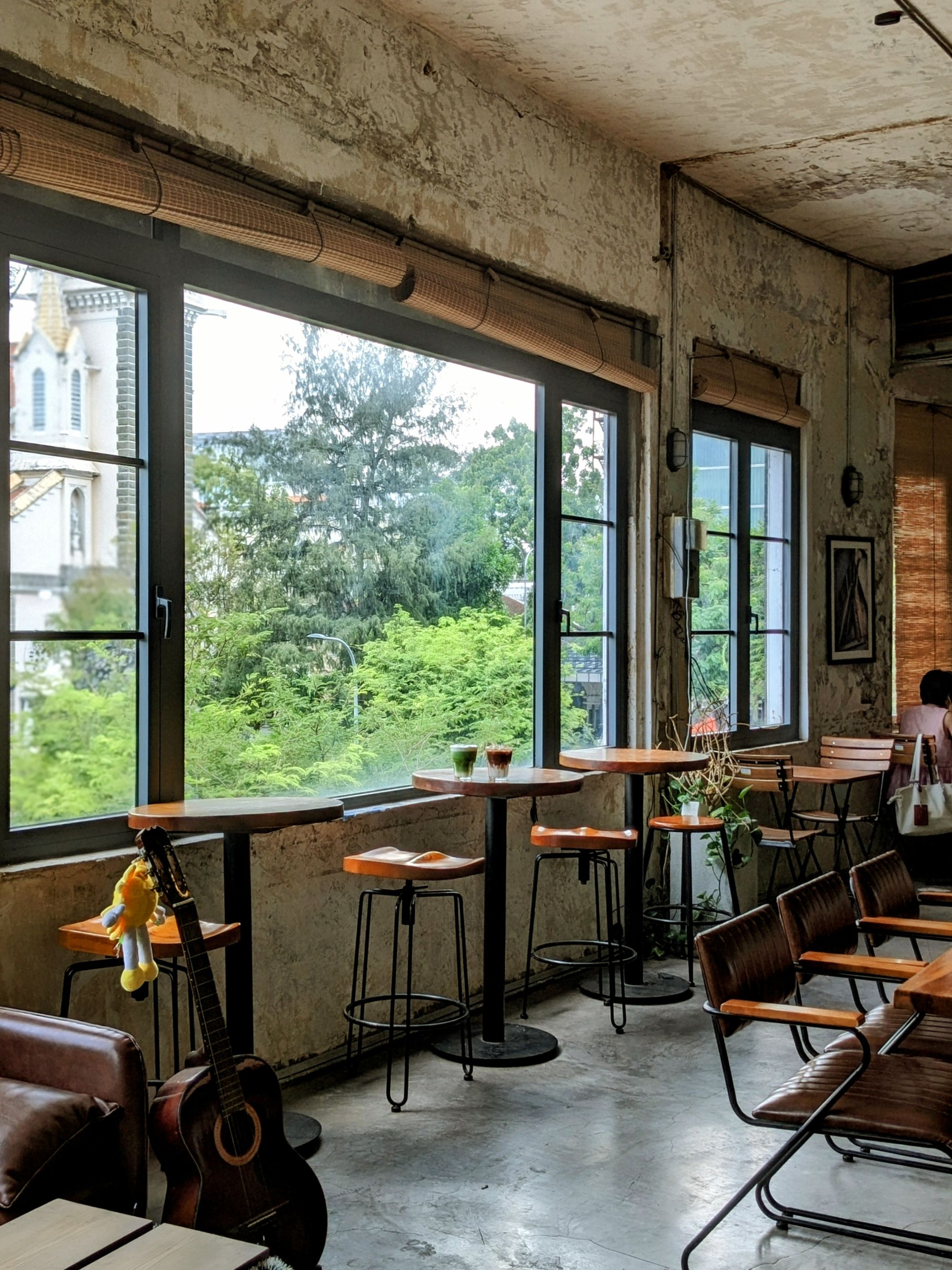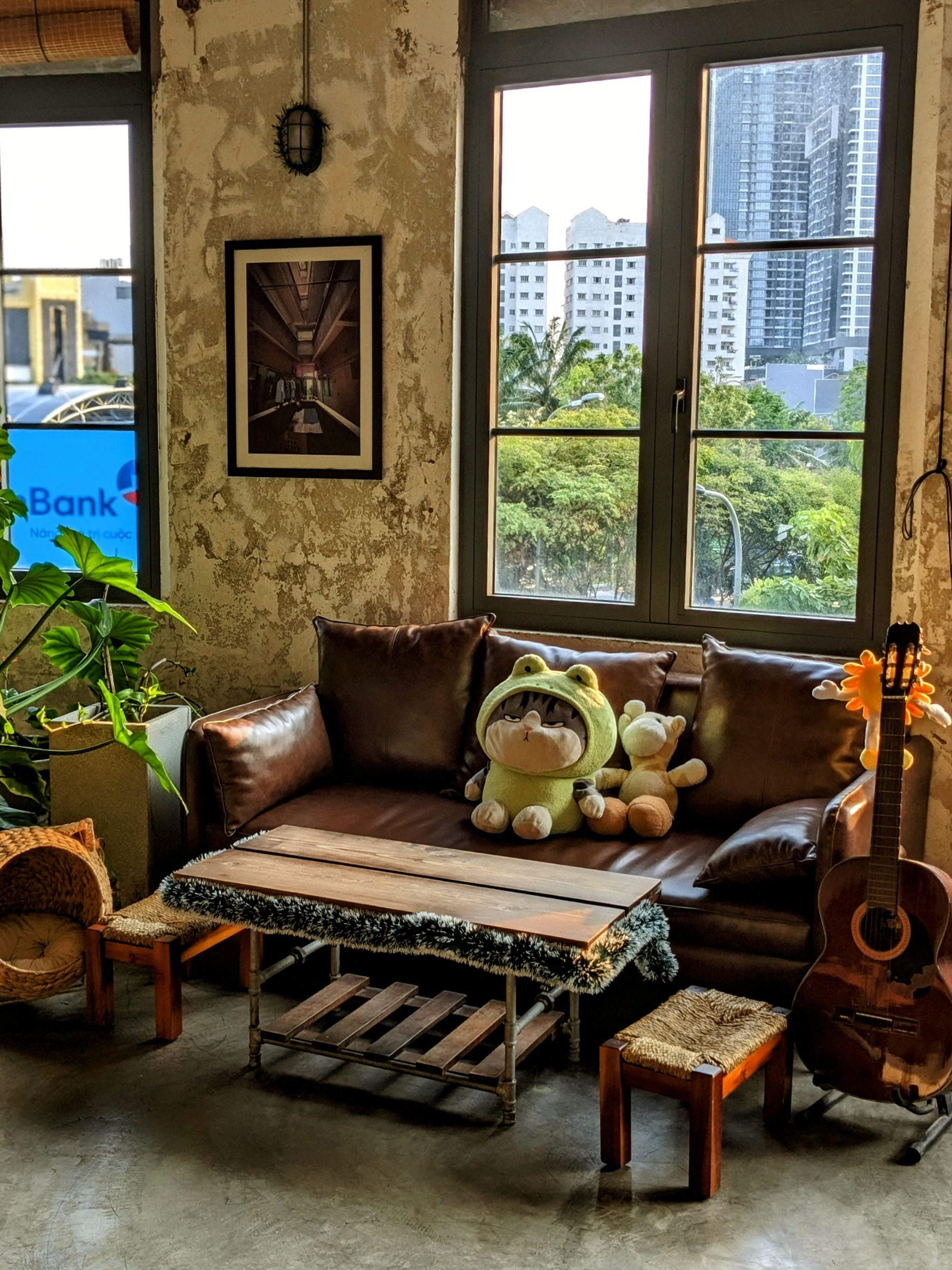 Ghế da nâu trầm, bàn gỗ với những đường vân tự nhiên, cây xanh trông như những nhánh mơ màng vươn mình ra ngoài cửa sổ… tất cả gom lại thành một bố cục vừa mộc mạc, vừa nghệ thuật – rất dễ để dừng lại vài phút, đặt ly cà phê xuống, và nhìn ngắm thế giới nhỏ bé xung quanh.