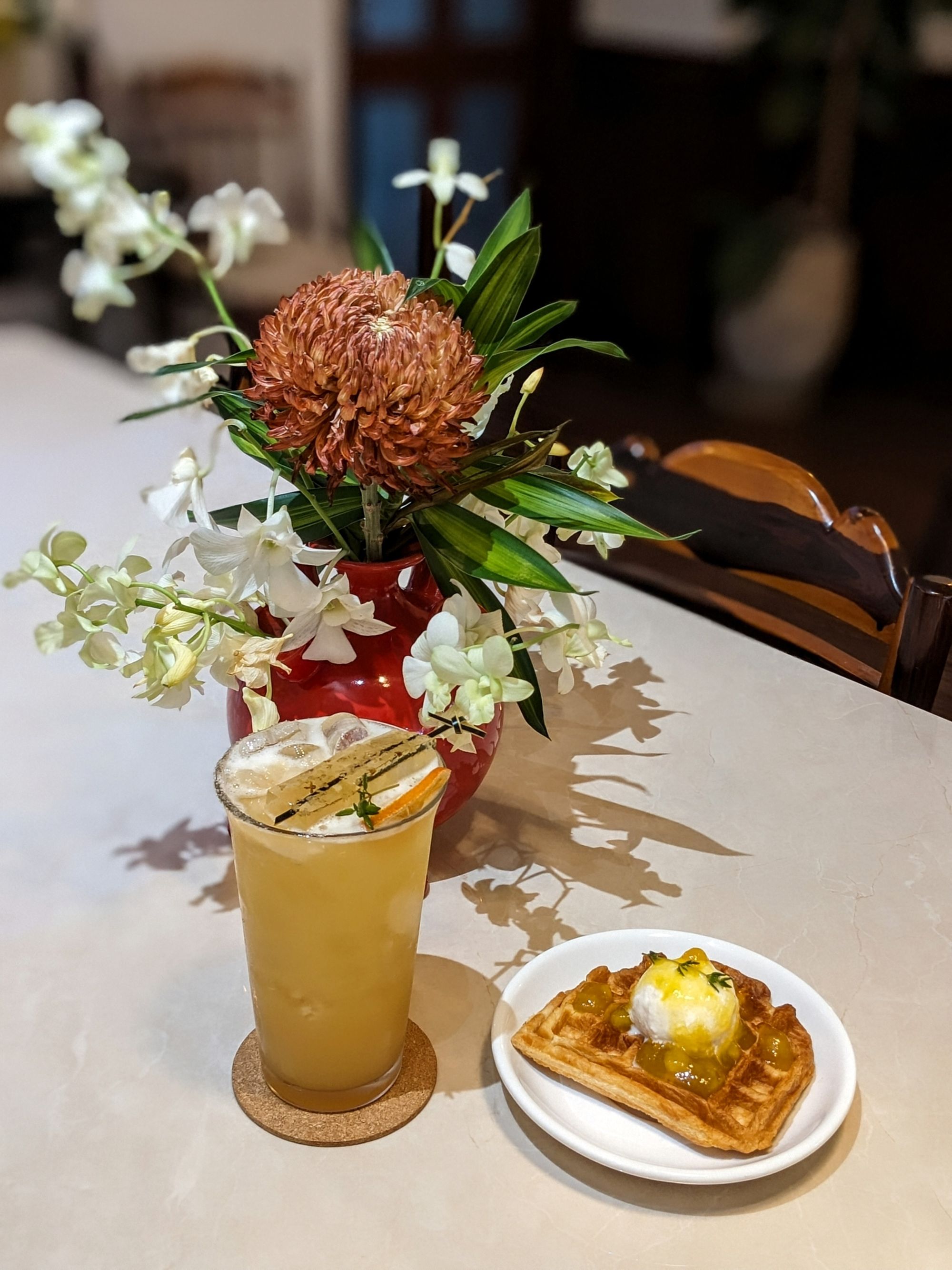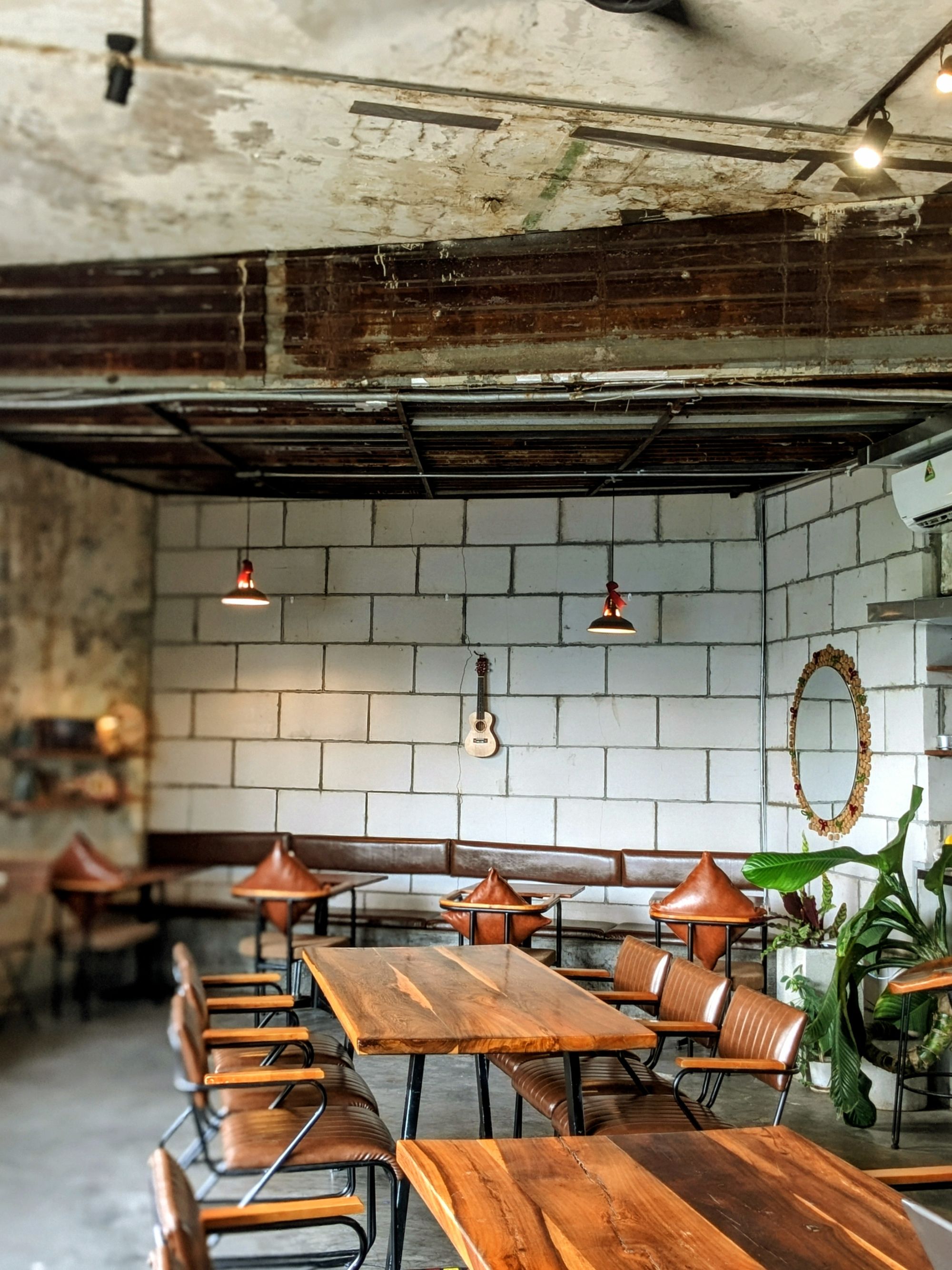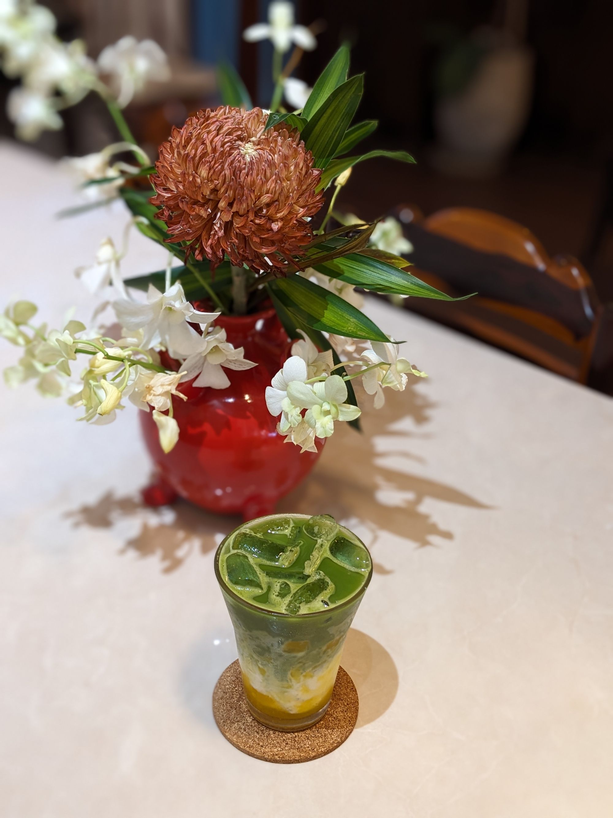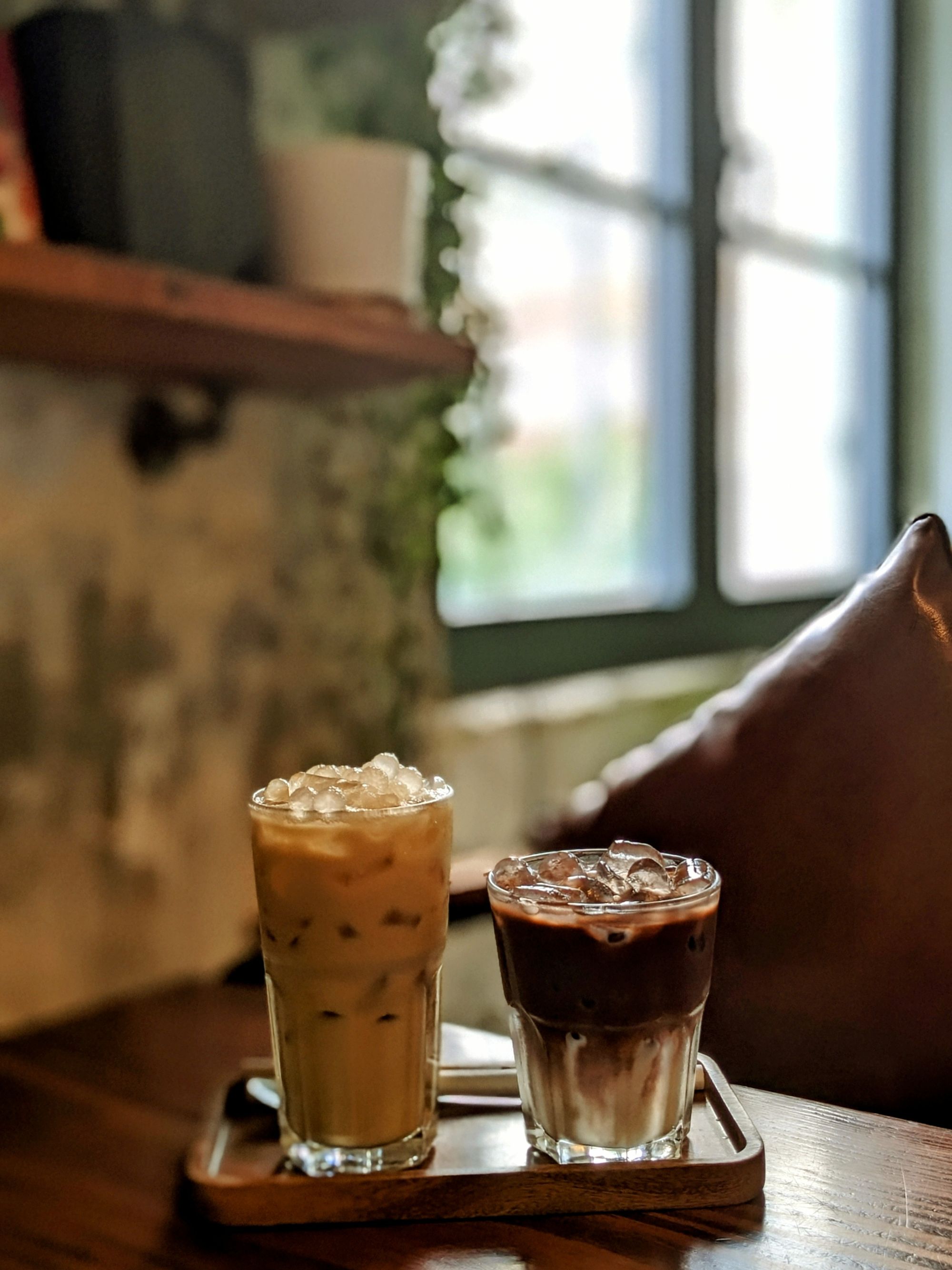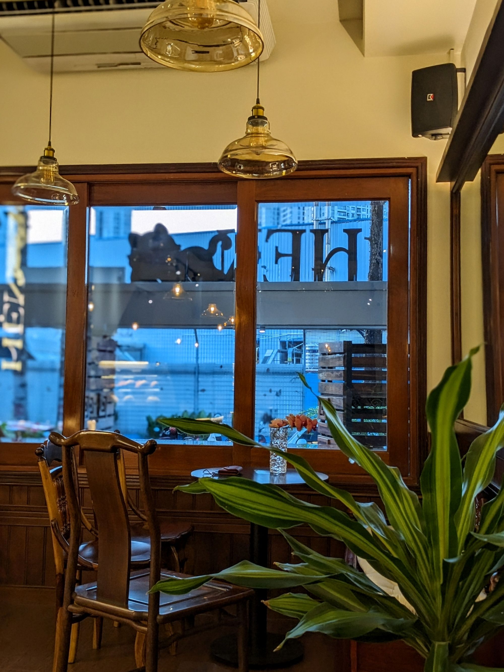 Ghế da nâu trầm, bàn gỗ với những đường vân tự nhiên, cây xanh trông như những nhánh mơ màng vươn mình ra ngoài cửa sổ… tất cả gom lại thành một bố cục vừa mộc mạc, vừa nghệ thuật – rất dễ để dừng lại vài phút, đặt ly cà phê xuống, và nhìn ngắm thế giới nhỏ bé xung quanh.