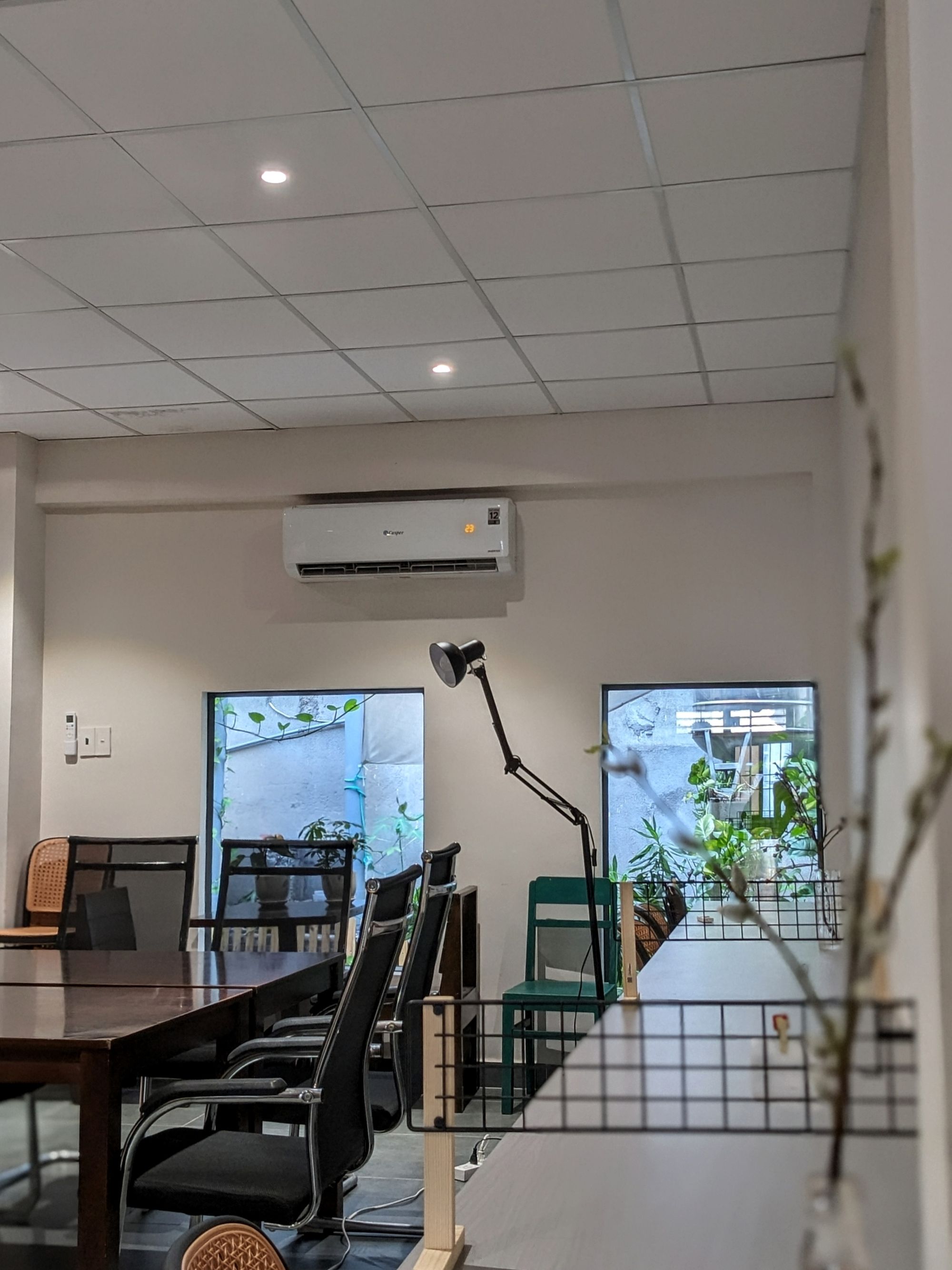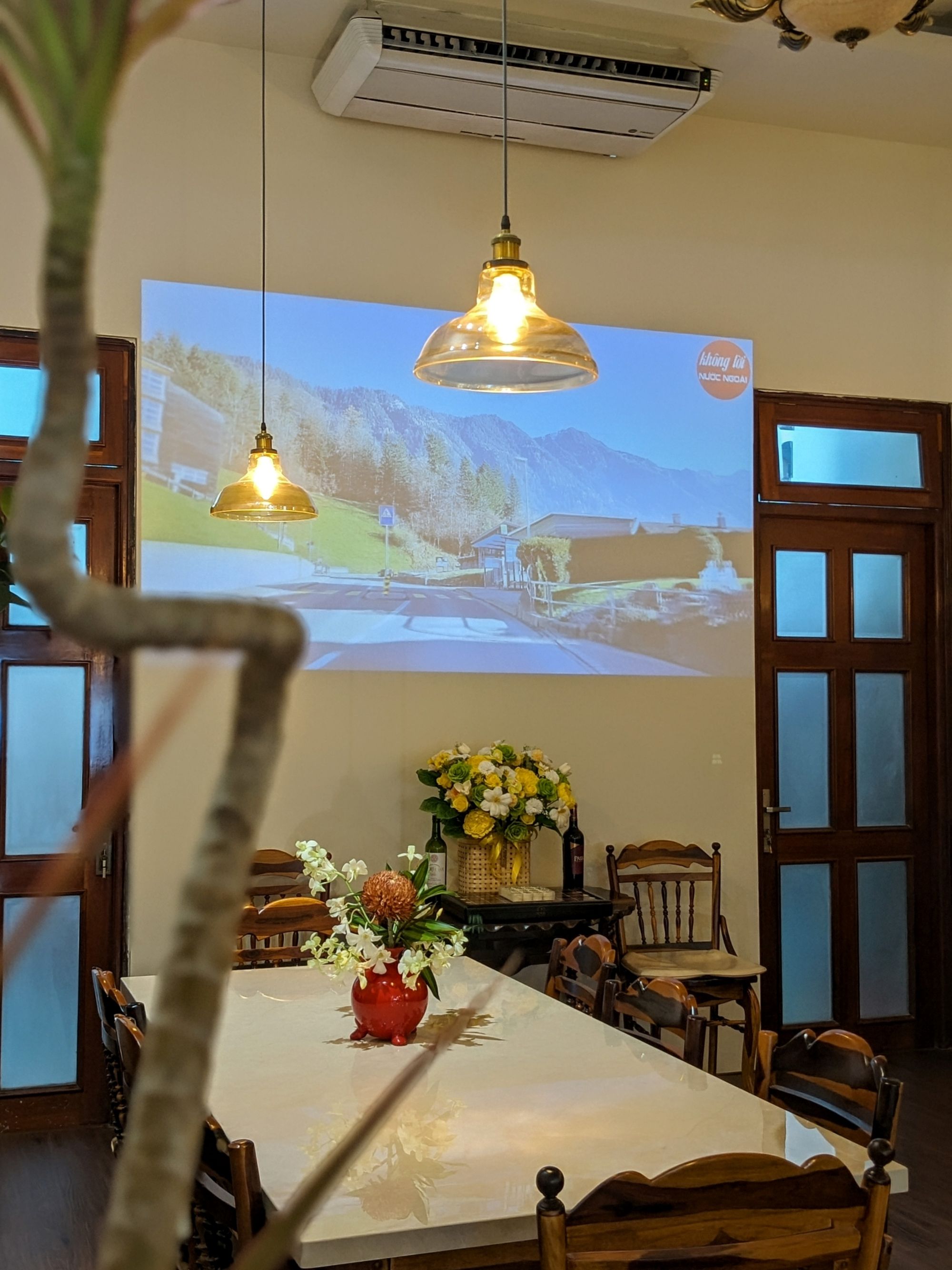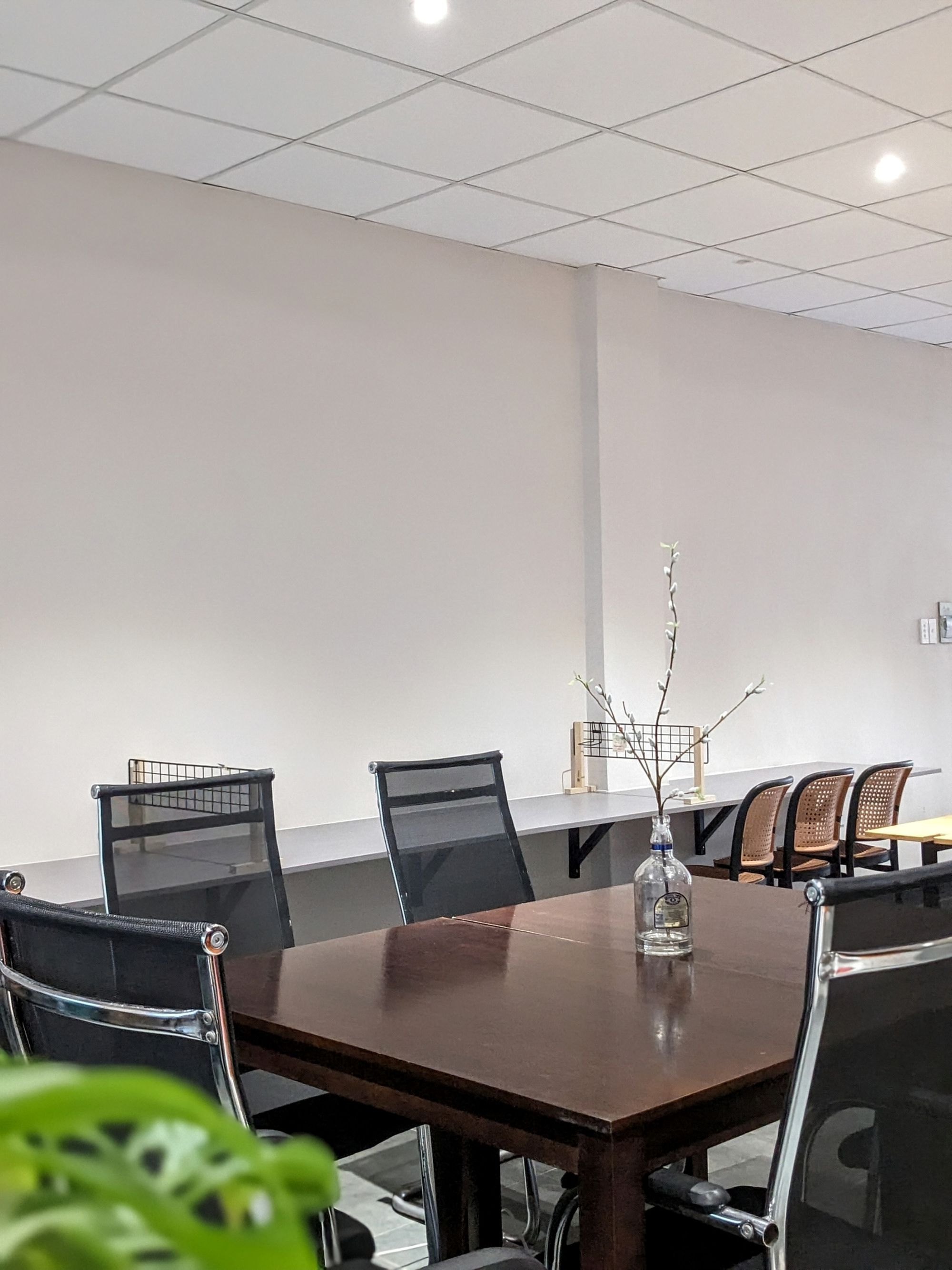 Lầu trên được thiết kế phục vụ workshop hoặc họp nhóm nhỏ, tối đa khoảng 35 người, vừa đảm bảo sự riêng tư vừa tiện nghi. Những chi tiết trang trí tinh tế – lọ hoa nhỏ, nhánh lựu đỏ hay những món đồ xinh xắn trên kệ sách – góp phần tạo nên một “góc mini retreat” giữa lòng thành phố.