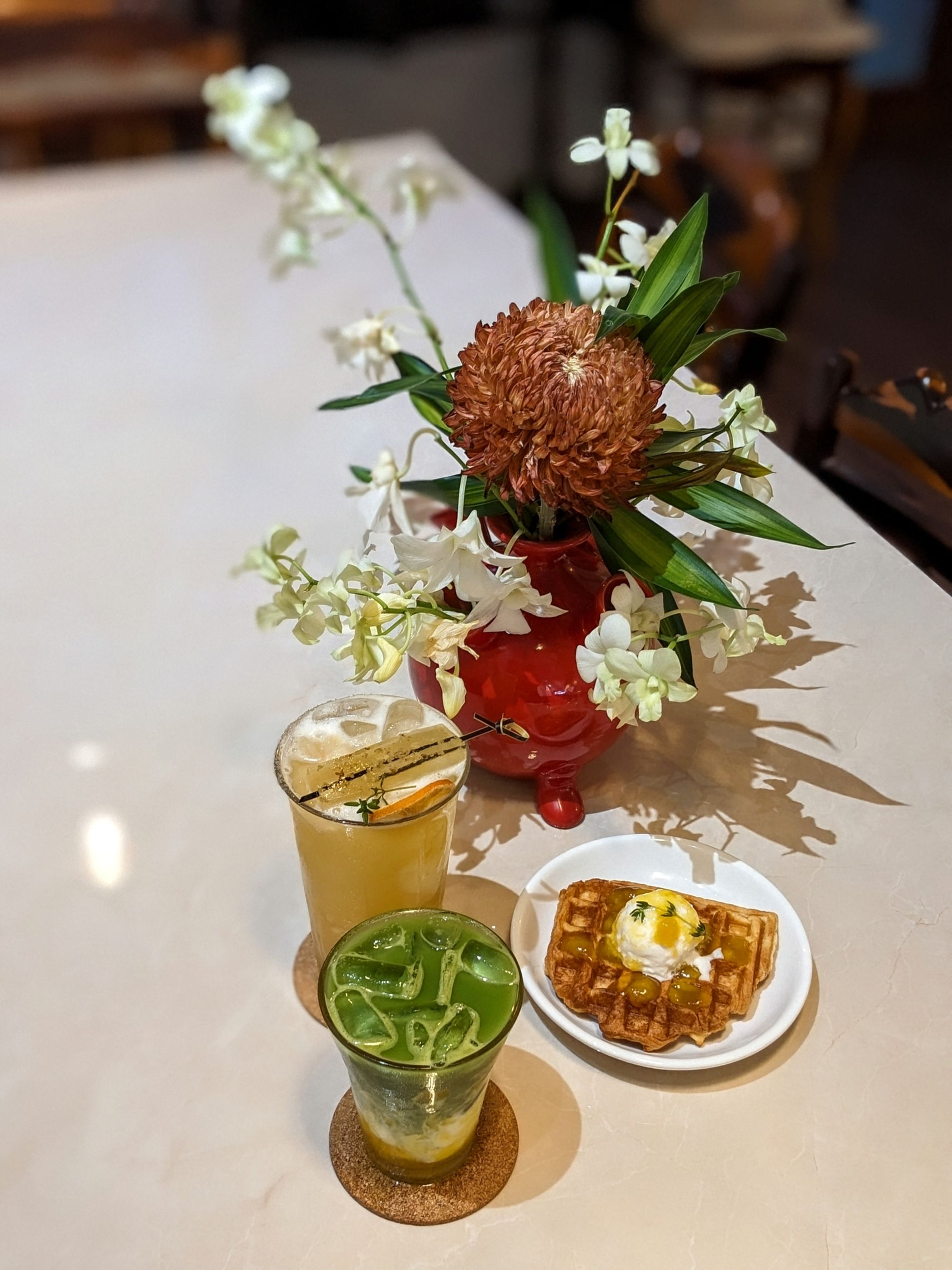 Menu tại Hẹn cũng có vài món ấn tượng như Matcha xoài latte với lớp xoài tươi vàng ươm hòa quyện cùng matcha thanh dịu, vừa đẹp mắt vừa thanh mát; trong khi waffle kèm kem và topping trái cây là món dessert “signature” giòn xốp, thơm ngọt, hoàn hảo để thưởng thức cùng cà phê hoặc nước trái cây.