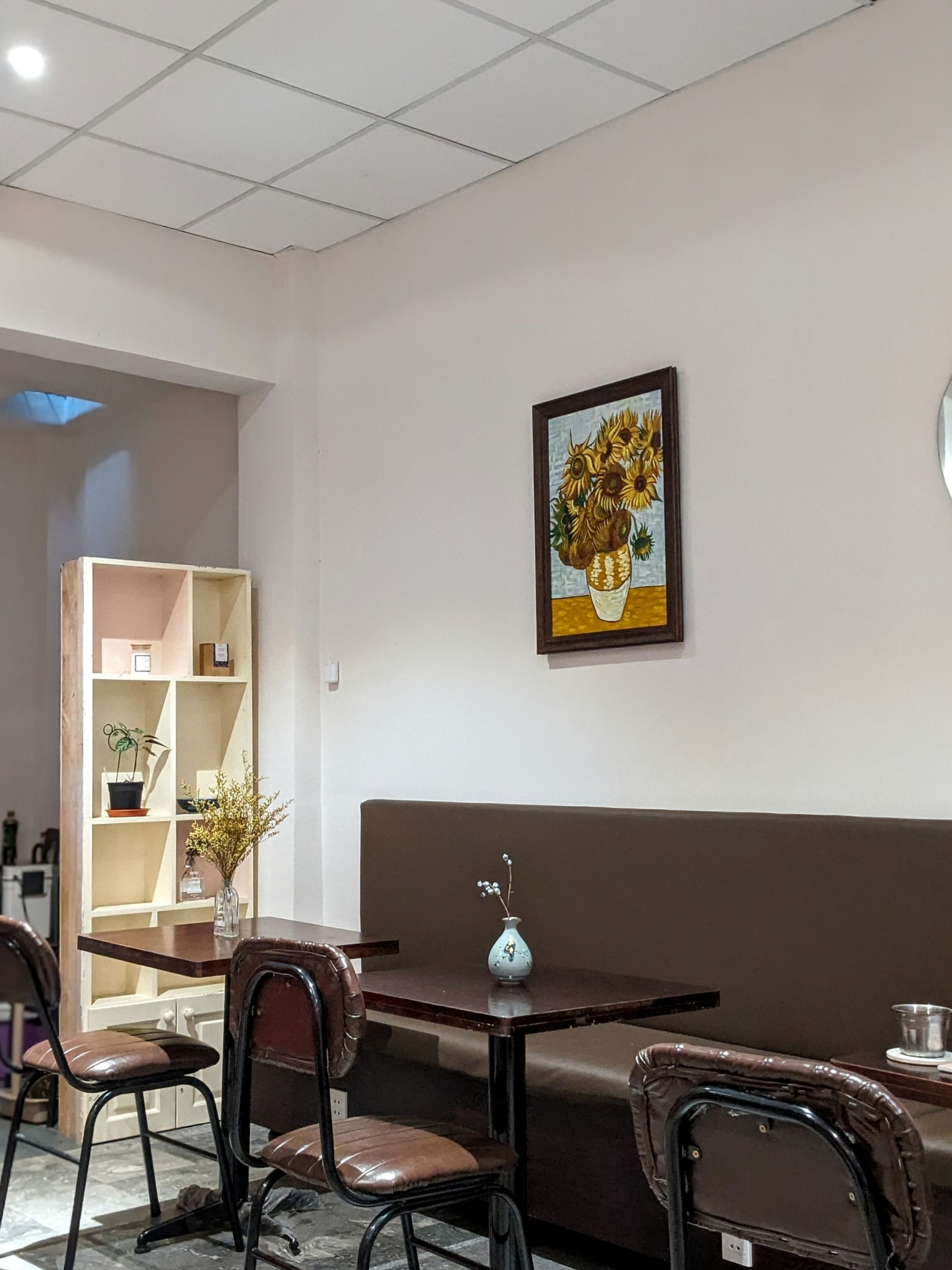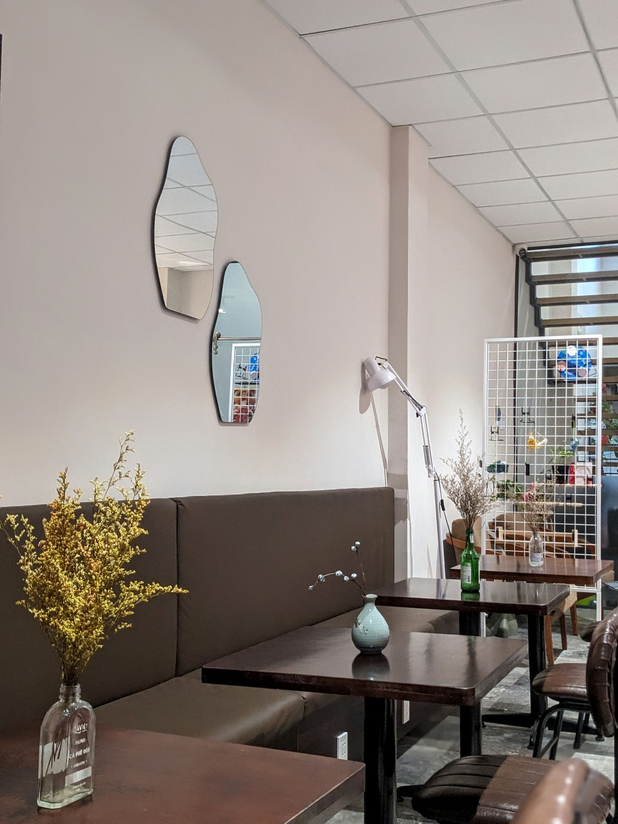 Không gian quán rộng rãi, có nhiều góc ngồi riêng tư lẫn bàn chung, rất phù hợp để tổ chức workshop, gặp gỡ bạn bè hoặc đơn giản là tận hưởng buổi chiều yên tĩnh. Những chi tiết nhỏ như cây xanh trang trí, bình hoa, cùng bàn cờ tạo điểm nhấn nhẹ nhàng, vừa mang đến sự sinh động, vừa không làm rối mắt. Một vài góc sát cửa kính còn tận dụng ánh sáng tự nhiên.