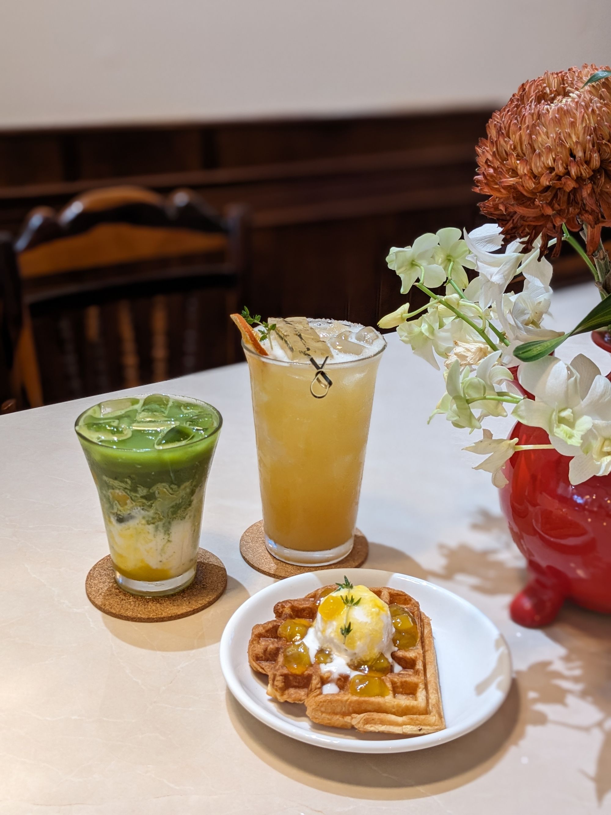 Menu tại Hẹn cũng có vài món ấn tượng như Matcha xoài latte với lớp xoài tươi vàng ươm hòa quyện cùng matcha thanh dịu, vừa đẹp mắt vừa thanh mát; trong khi waffle kèm kem và topping trái cây là món dessert “signature” giòn xốp, thơm ngọt, hoàn hảo để thưởng thức cùng cà phê hoặc nước trái cây.