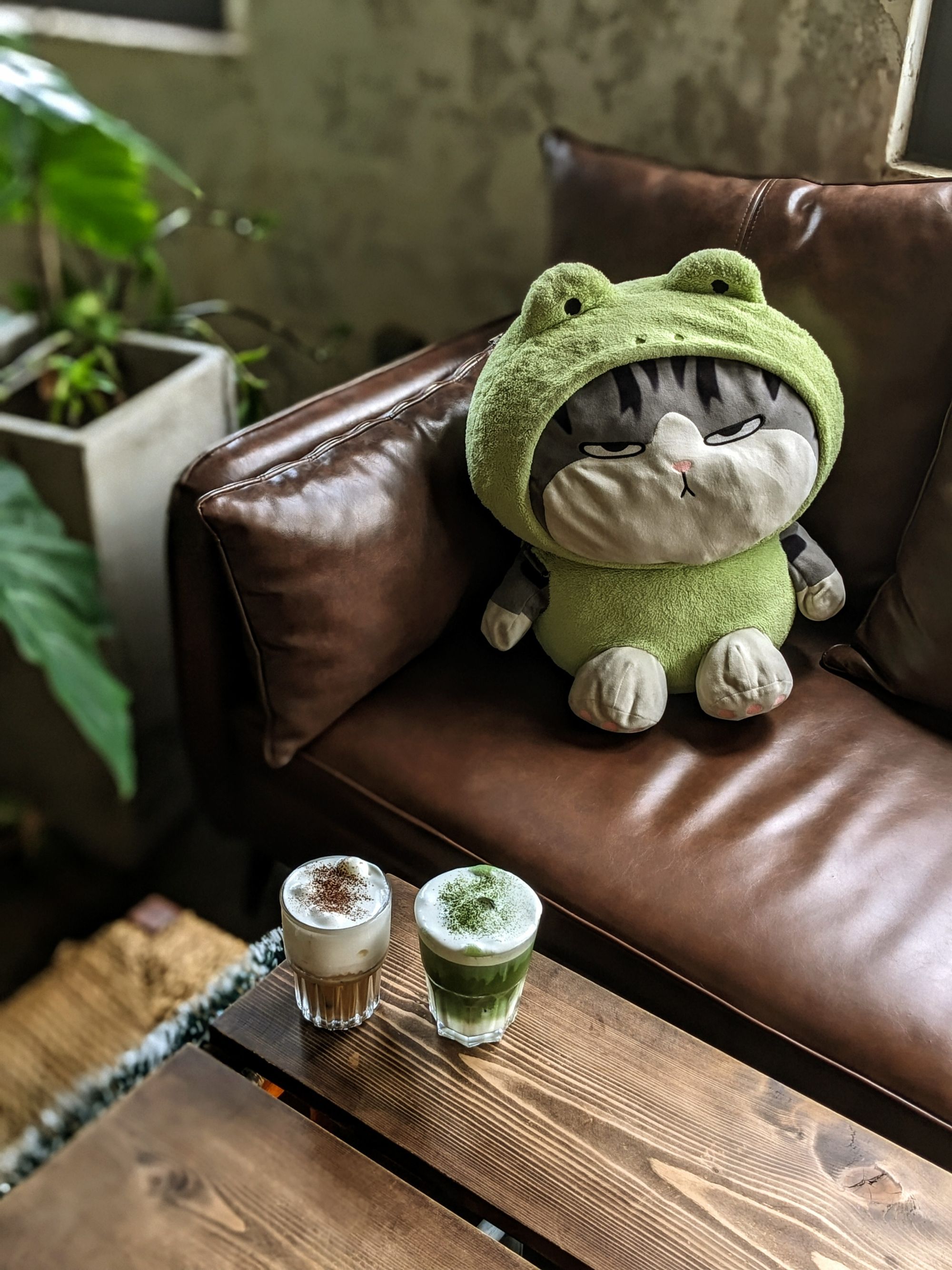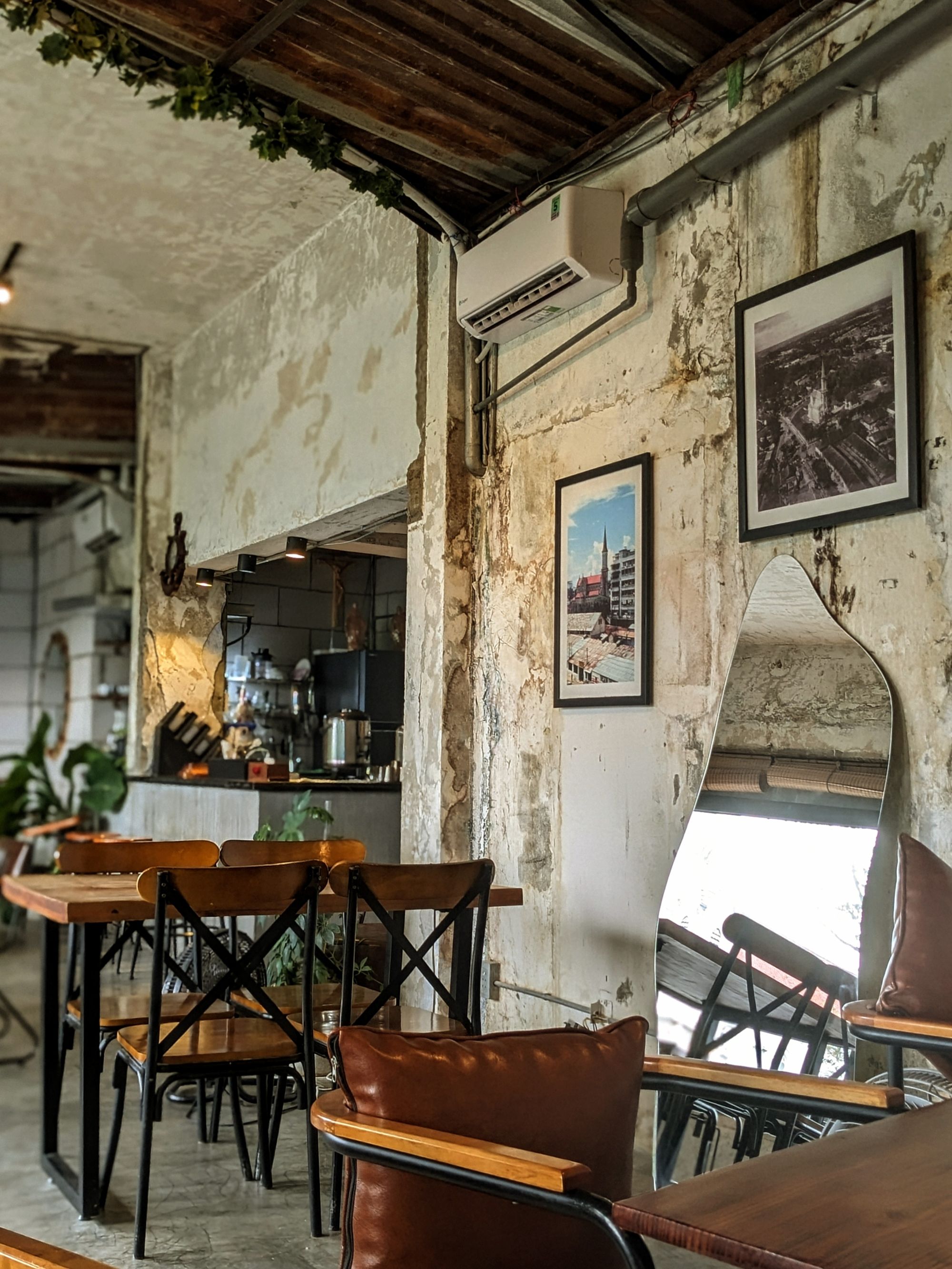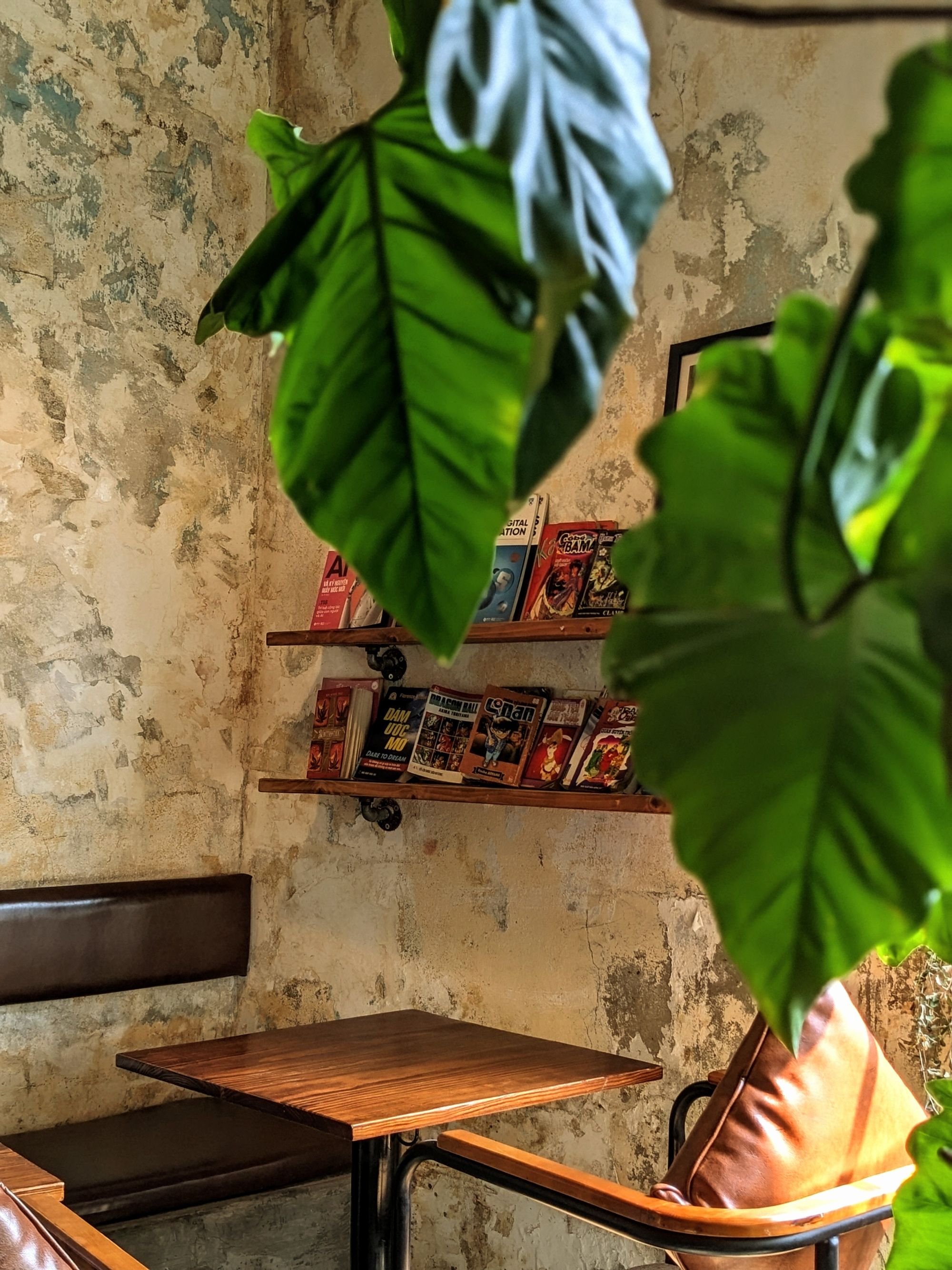 Ghế da nâu trầm, bàn gỗ với những đường vân tự nhiên, cây xanh trông như những nhánh mơ màng vươn mình ra ngoài cửa sổ… tất cả gom lại thành một bố cục vừa mộc mạc, vừa nghệ thuật — rất dễ để dừng lại vài phút, đặt ly cà phê xuống, và nhìn ngắm thế giới nhỏ bé xung quanh.