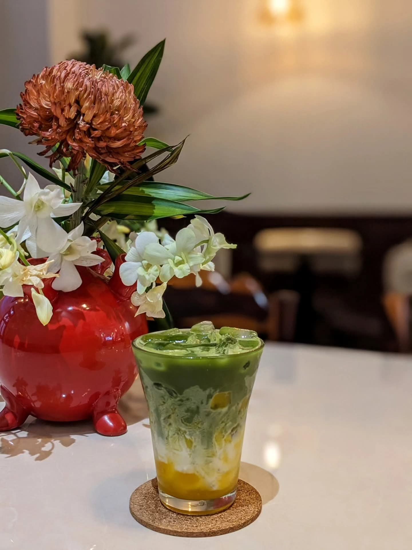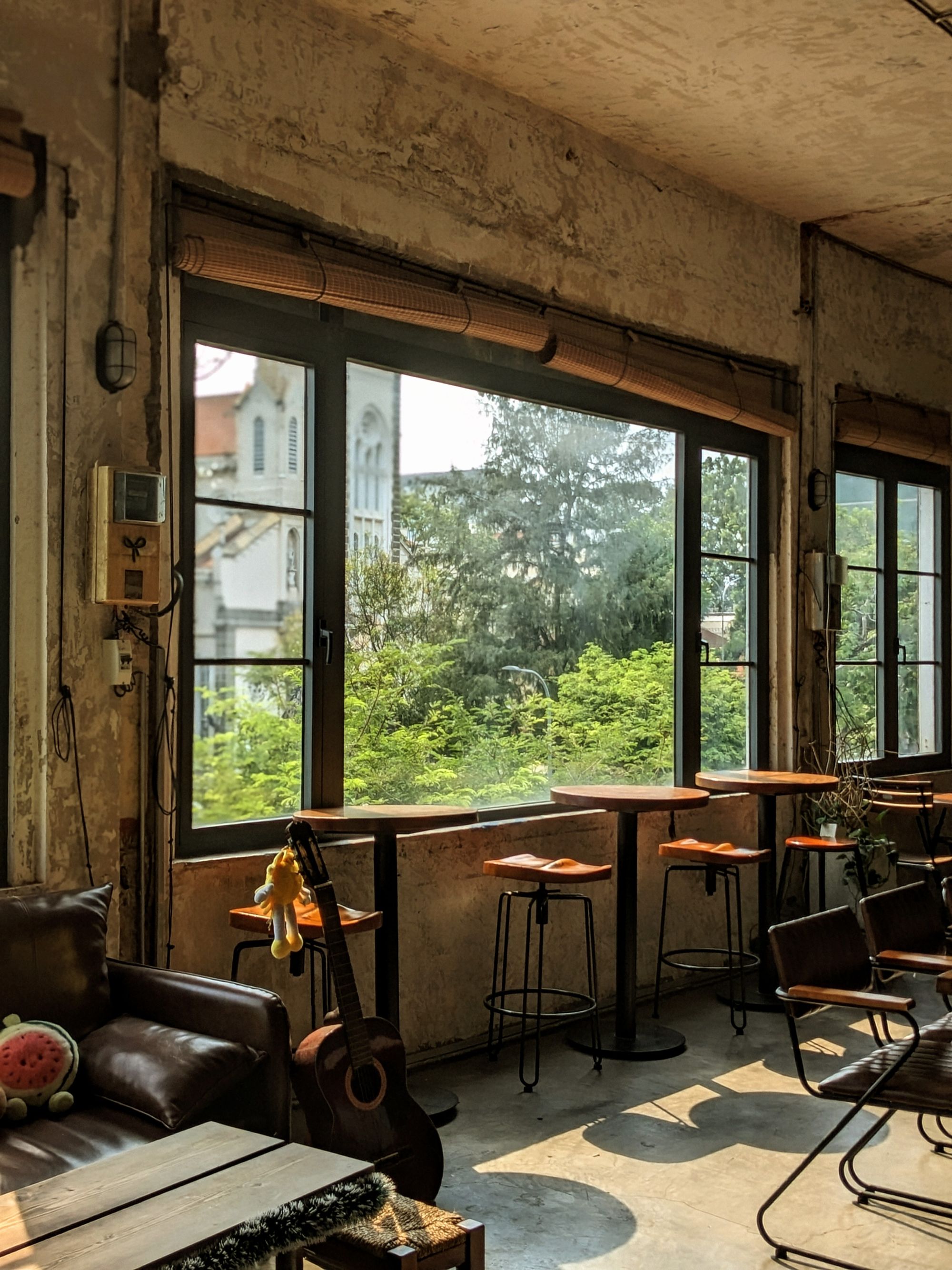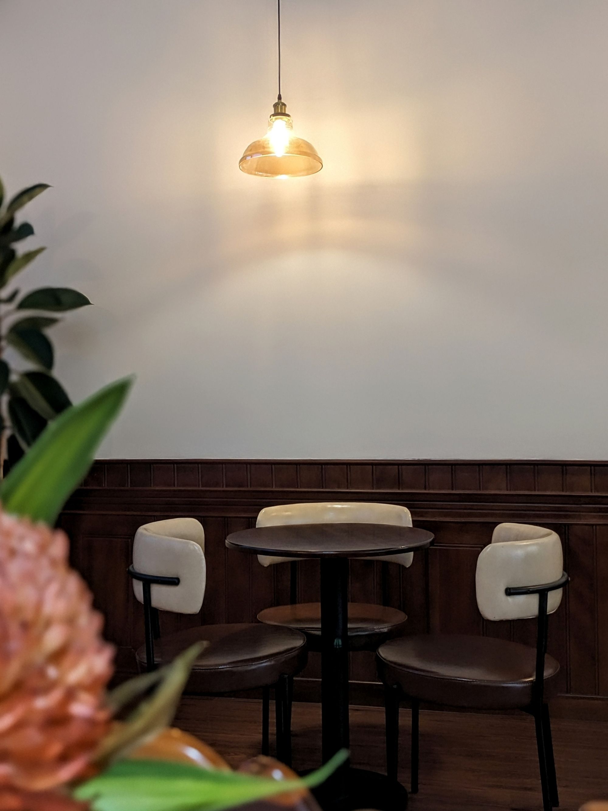 Ghế da nâu trầm, bàn gỗ với những đường vân tự nhiên, cây xanh trông như những nhánh mơ màng vươn mình ra ngoài cửa sổ… tất cả gom lại thành một bố cục vừa mộc mạc, vừa nghệ thuật — rất dễ để dừng lại vài phút, đặt ly cà phê xuống, và nhìn ngắm thế giới nhỏ bé xung quanh.