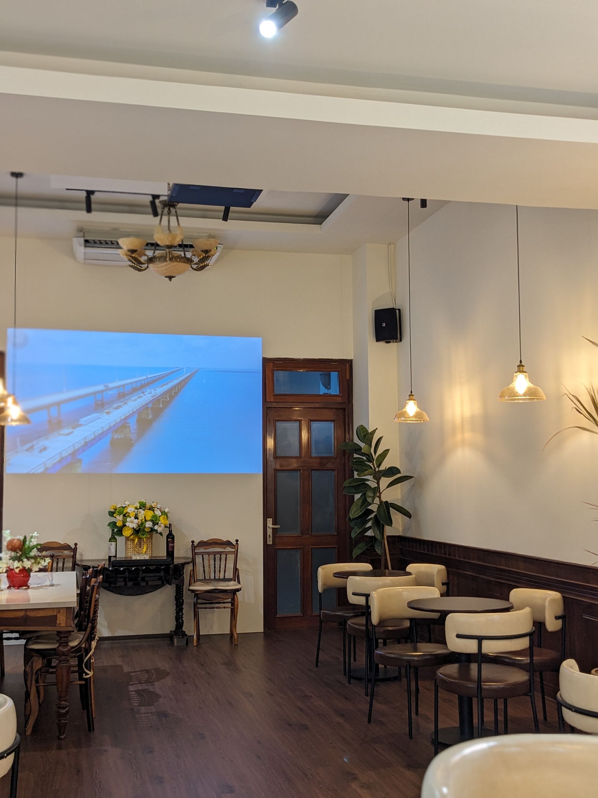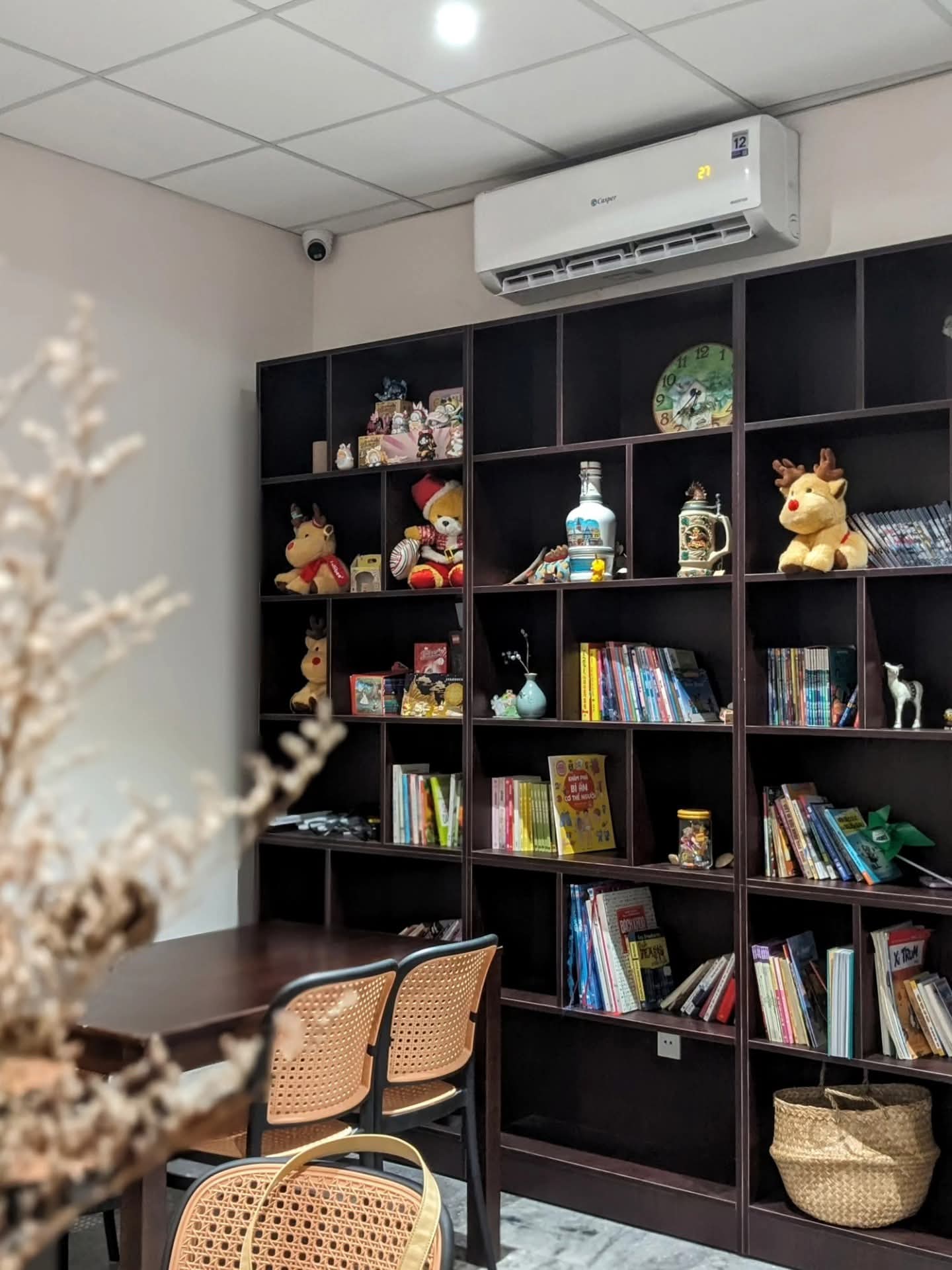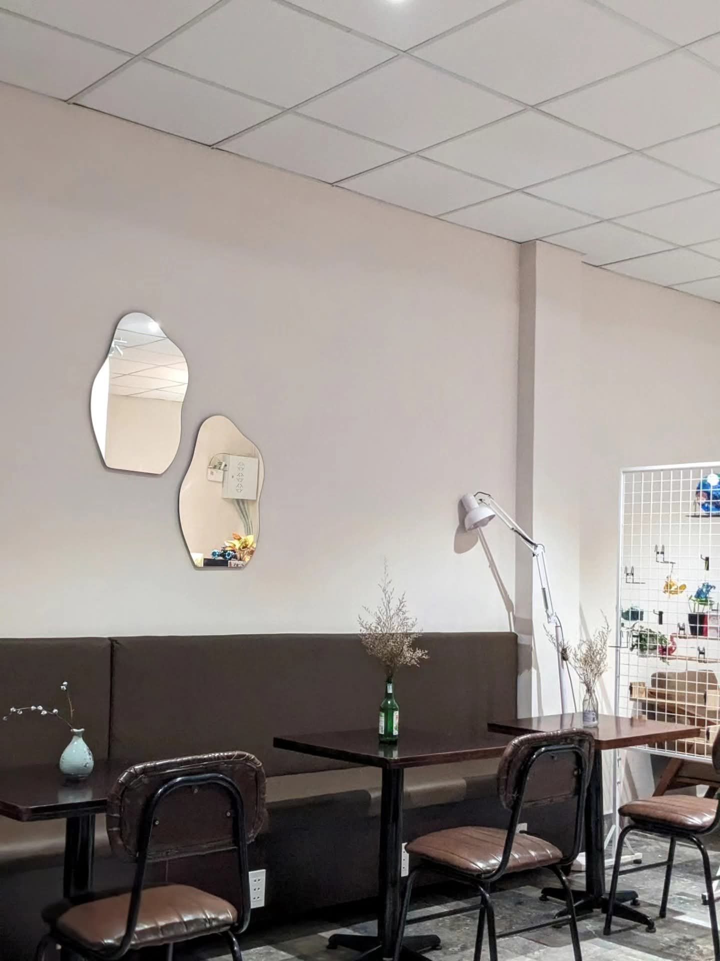Không gian quán rộng rãi, có nhiều góc ngồi riêng tư lẫn bàn chung, rất phù hợp để tổ chức workshop, gặp gỡ bạn bè hoặc đơn giản là tận hưởng buổi chiều yên tĩnh. Những chi tiết nhỏ như cây xanh trang trí, bình hoa, cùng bàn cờ tạo điểm nhấn nhẹ nhàng, vừa mang đến sự sinh động, vừa không làm rối mắt. Một vài góc sát cửa kính còn tận dụng ánh sáng tự nhiên.