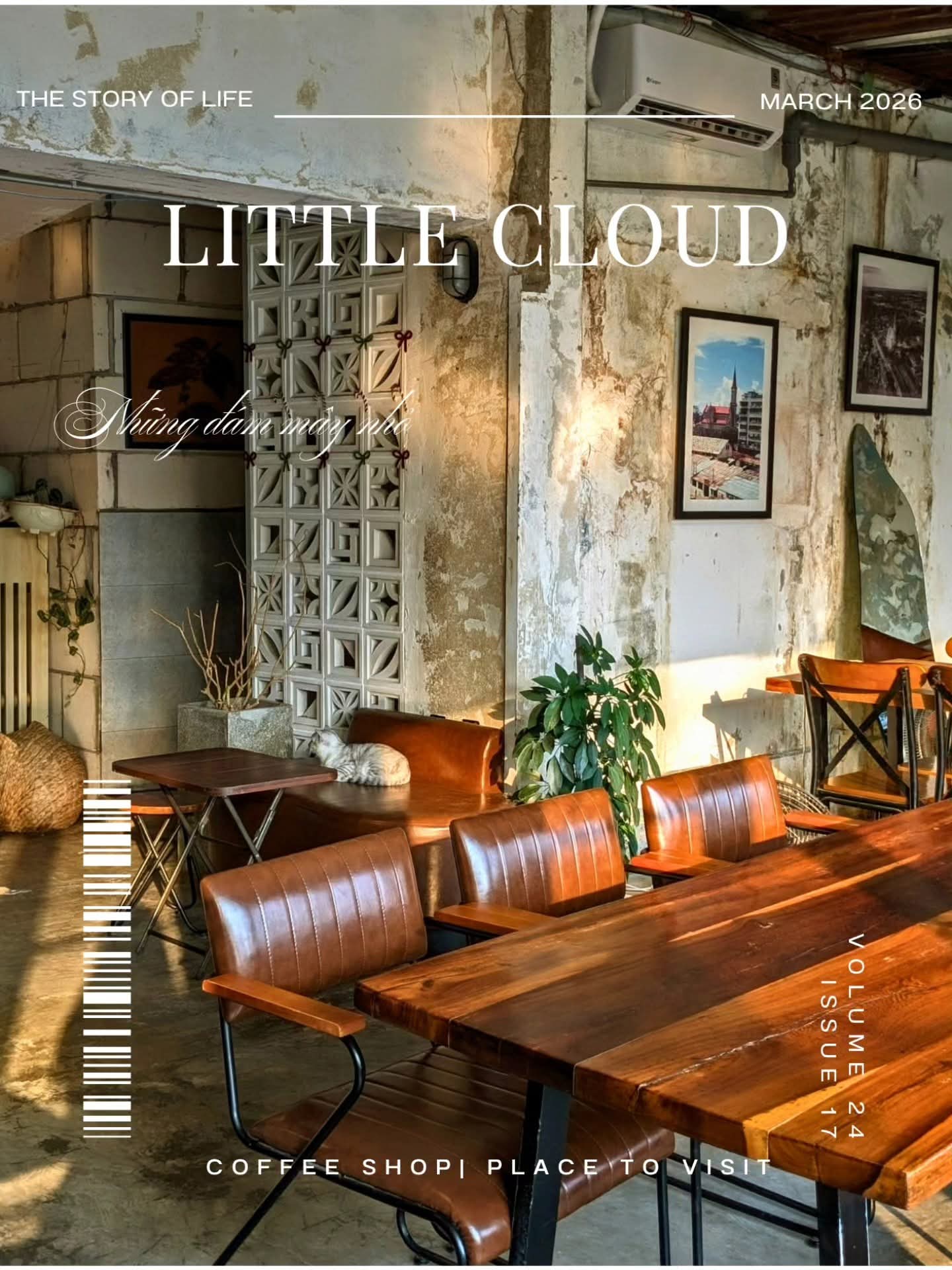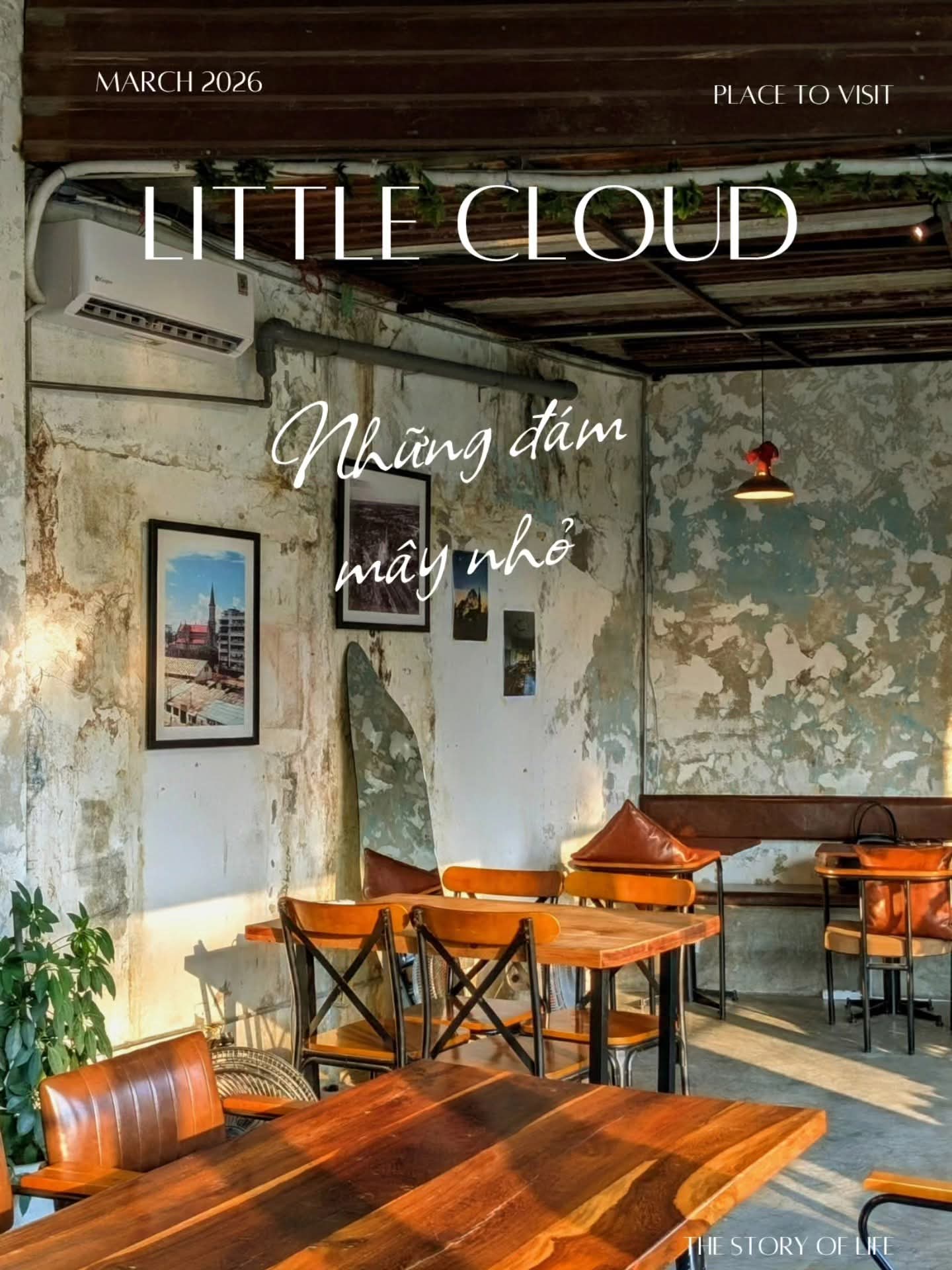 Bước vào Little Cloud, cảm giác đầu tiên là một không gian cổ điển nhưng không cũ kỹ, nơi mà từng vết tường bong tróc, từng thanh gỗ nâu trầm đều như kể một câu chuyện riêng. Ánh sáng dịu nhẹ xuyên qua khung cửa to, cân bằng nét ấm cúng với hơi thở hoài cổ đầy thư thái. Đây không chỉ là quán cà phê, mà là một góc tĩnh lặng để tâm hồn thả trôi.