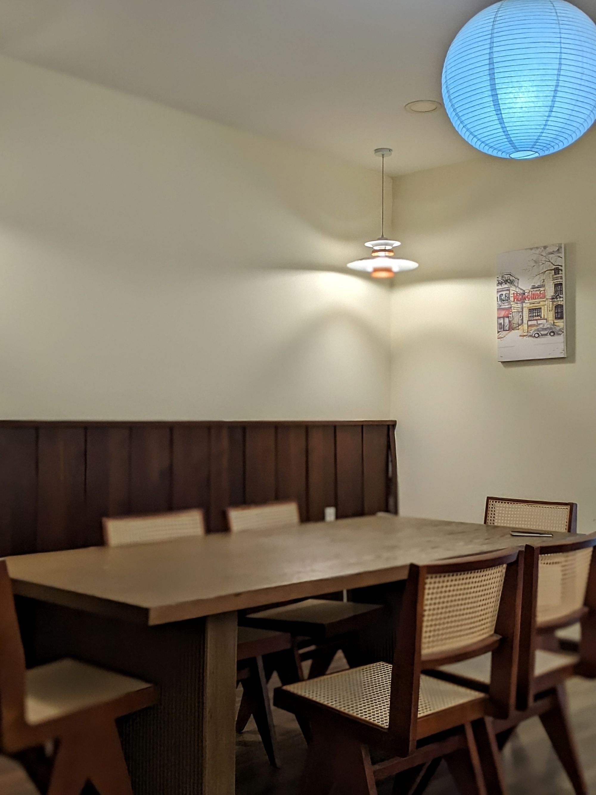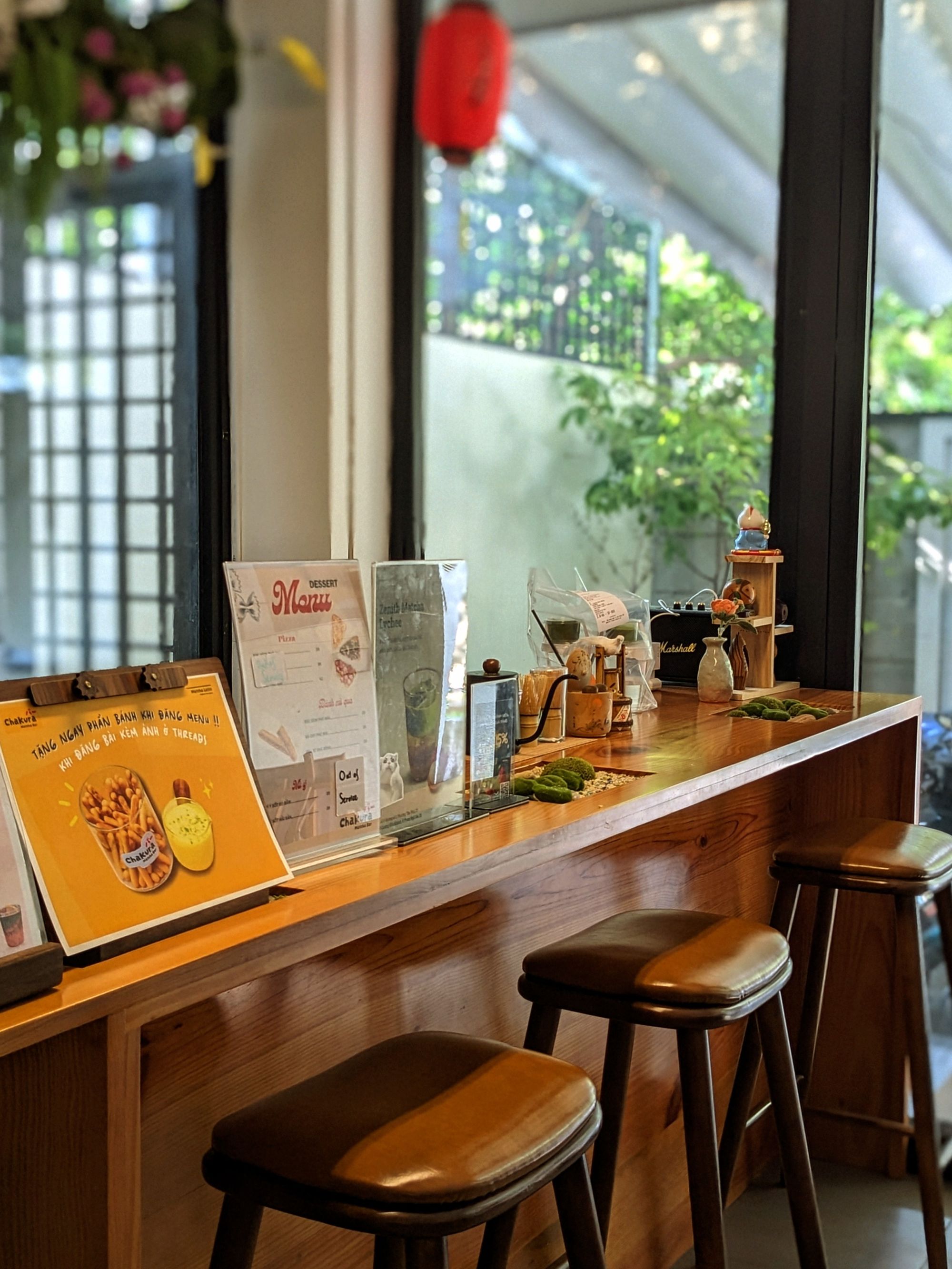 Tại Quận 7, không gian rộng rãi, ấm cúng với bàn ghế gỗ và ánh sáng dịu, lý tưởng để nhâm nhi matcha, cà phê, chocolate hay thưởng thức chút bánh ngọt, bánh mì que hay pizza. Đây là nơi bạn vừa có thể trò chuyện thoải mái, vừa tìm được góc yên tĩnh để làm việc.