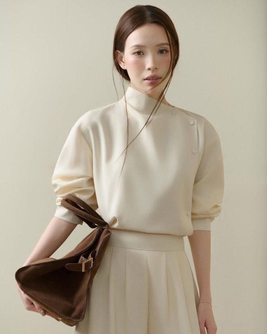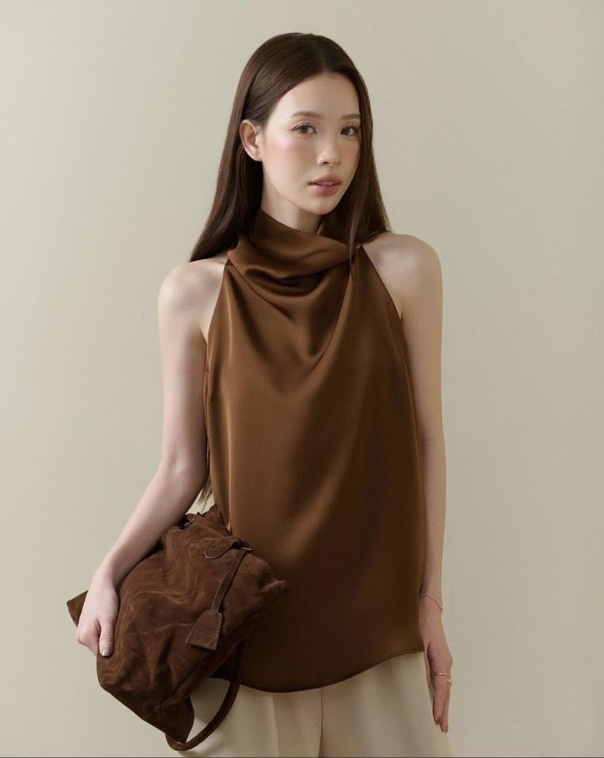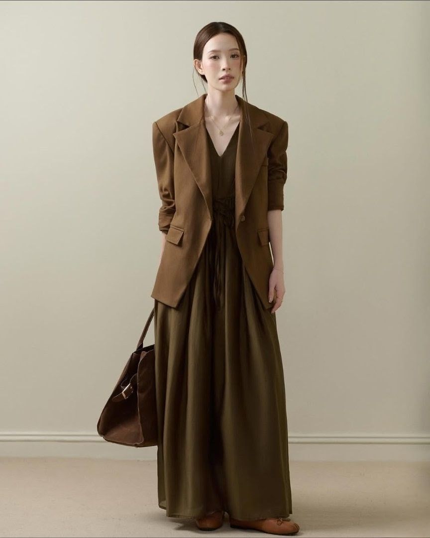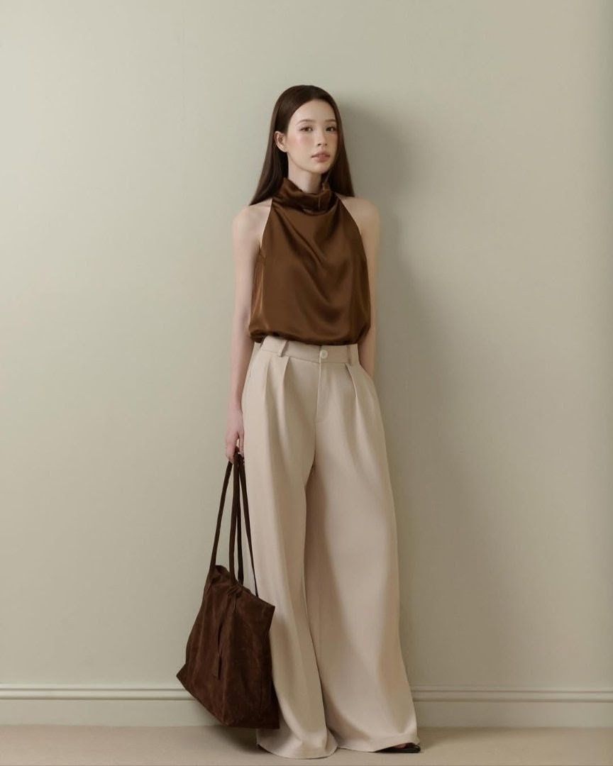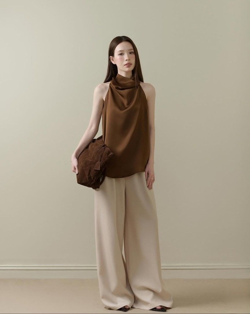 - Huyền mở đầu BST với sắc nâu trầm, gam màu đại diện cho sự lắng lại. Không phải nâu ấm của mùa thu, mà là nâu đã dịu, đã chậm, mang cảm giác tĩnh hơn và sâu hơn. Những lựa chọn lúc này thiên về sự kín đáo, vừa đủ và ổn định. Huyền là chiếc áo lụa cổ đổ buông rơi nhẹ, như một khoảng chuyển, nơi mùa đông bắt đầu được cảm nhận bằng trạng thái hơn là nhiệt độ.