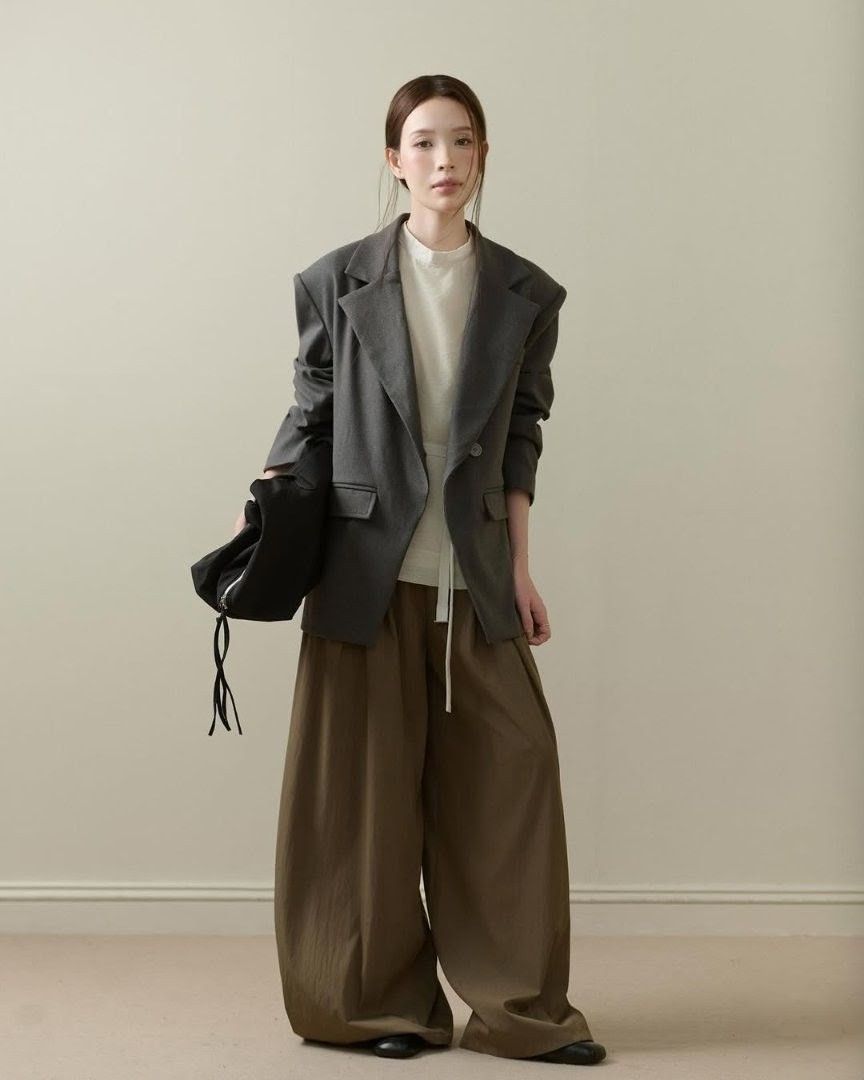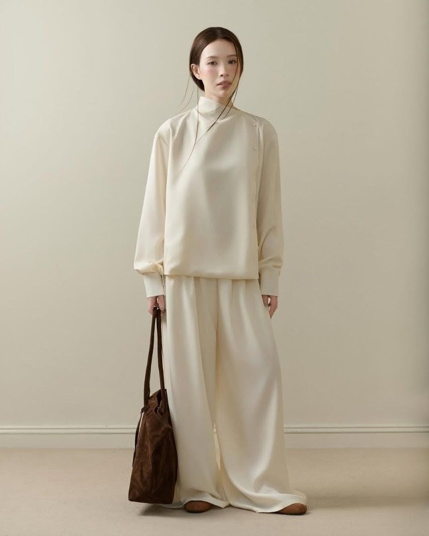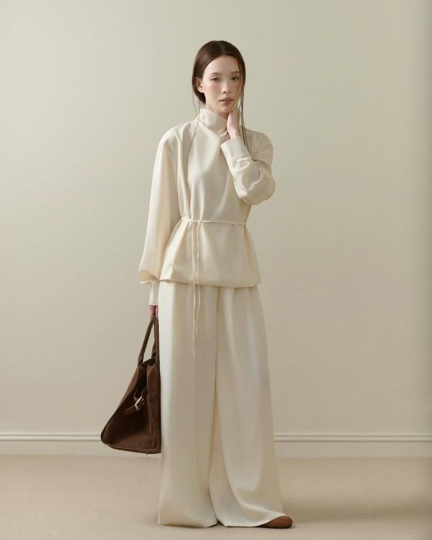 - Nhiên là khi mùa đông không còn cố gắng trở nên lạnh. Nhiên là giai đoạn mùa đông trở nên dễ chịu nhất. Những gì hiện diện đều mang tính bản năng, như cách đất giữ màu nâu của nó, như cách vải giữ hơi ấm rất khẽ. Không phô bày, không che giấu: Chiếc áo tơ dáng suông, với dây cột eo tạo điểm nhấn nhẹ nhàng phối cùng quần gió ống rộng.