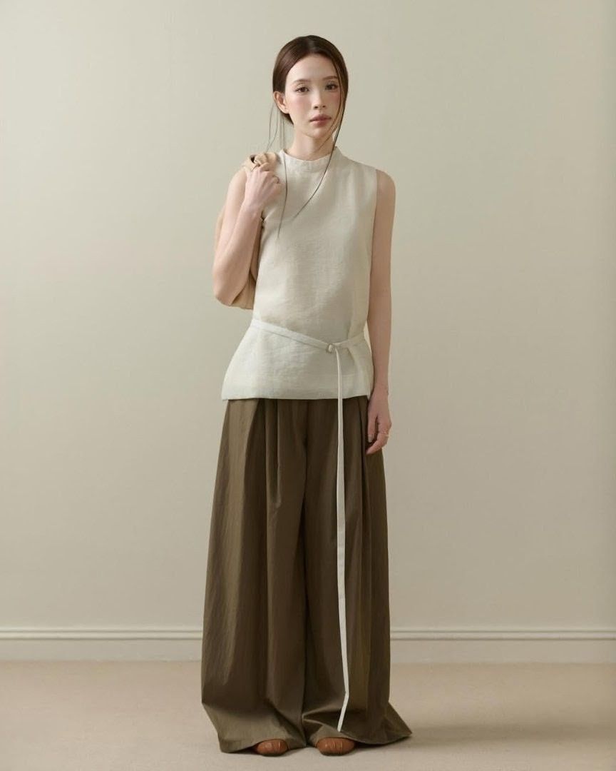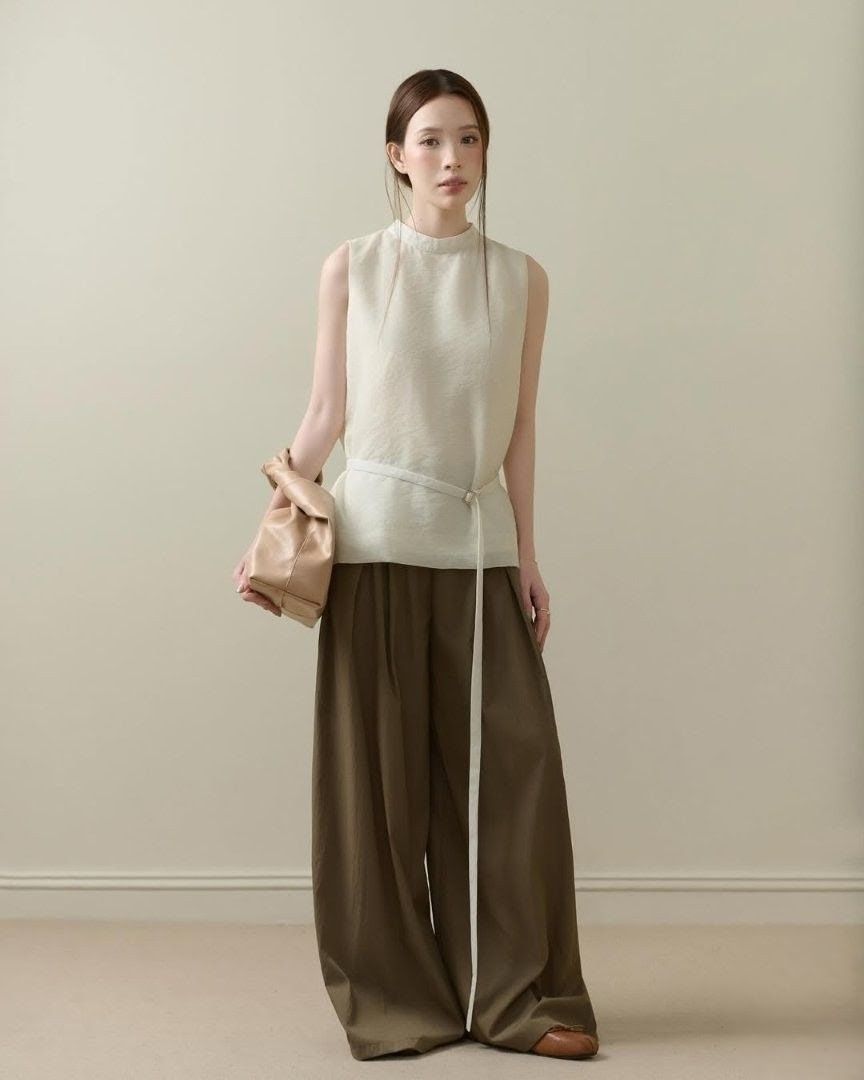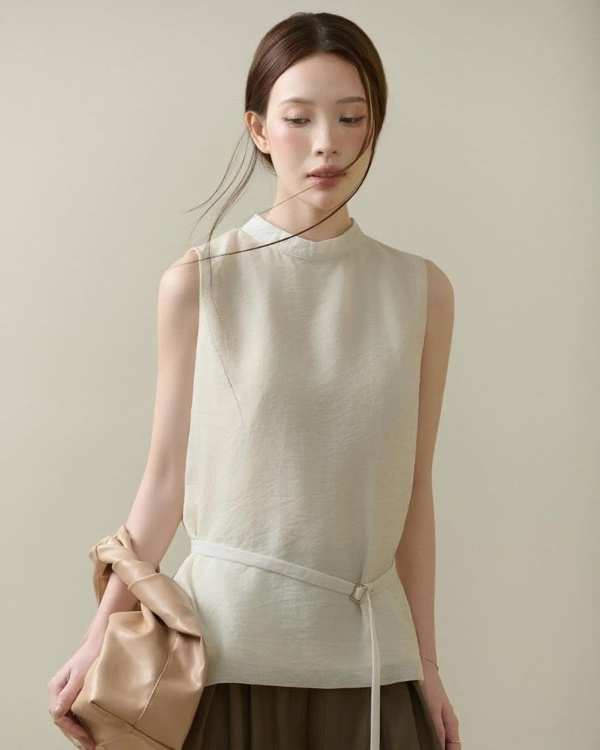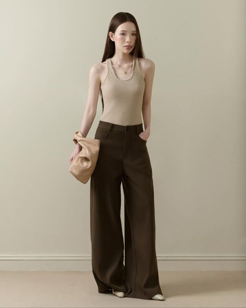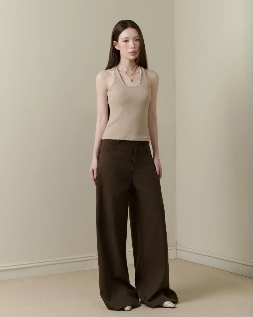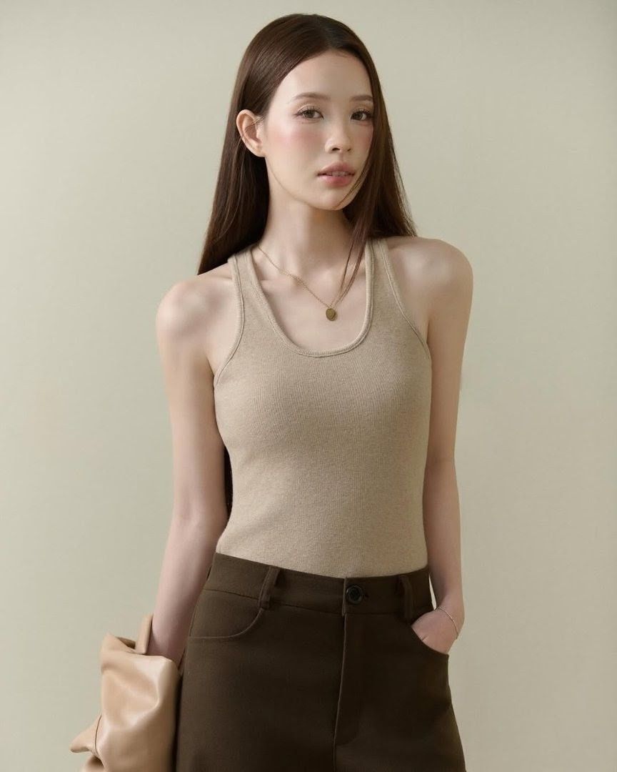 - Tan là khoảnh khắc mùa không còn ranh giới rõ ràng. Không còn là thu, nhưng cũng chưa hẳn là đông. Không khí nhẹ hơn, ánh sáng dịu xuống, mọi thứ như được phủ một lớp màu be rất mỏng. Chiếc áo ba lỗ với chất liệu len tăm mang theo cảm giác trung hòa rất dễ chịu của khoảnh khắc giao mùa. Không gợi buồn, cũng không quá ấm áp.