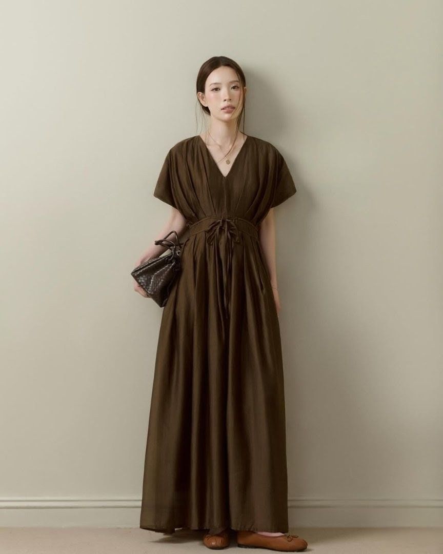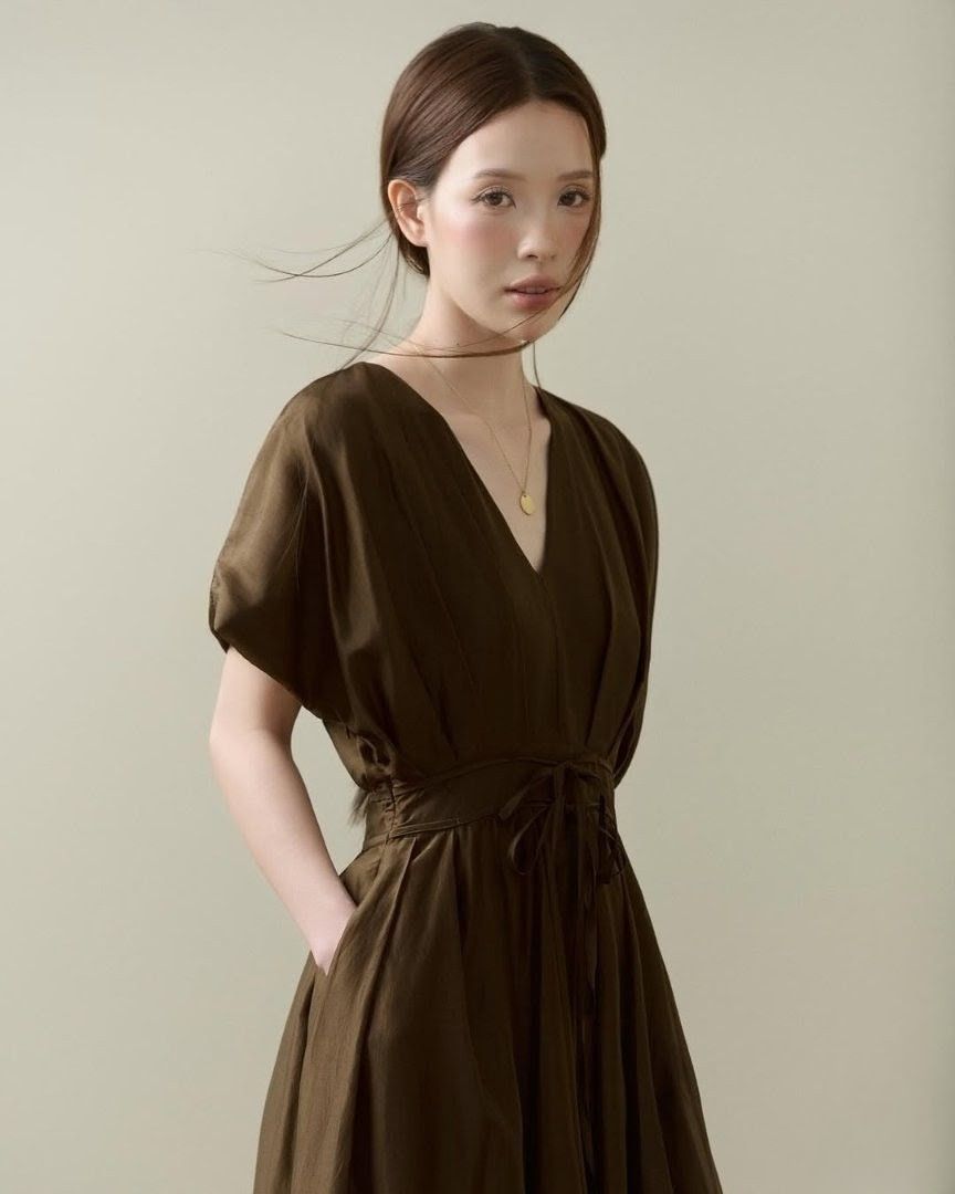- Tĩnh là khoảnh khắc mùa đông ngừng dịch chuyển. Không còn gió, không còn chuyển mùa, chỉ còn lại không gian đứng yên và nhịp thở chậm rãi. Sắc nâu trầm lắng xuống, như mặt đất sau nhiều ngày lạnh, giữ lại hơi ấm rất kín. Chiếc váy cổ chữ Và dài thướt tha thắt eo nhẹ nhàng. Chất liệu tơ Nhật dày hai lớp tạo nên độ rủ tự nhiên, giữ form tinh tế mà vẫn nhẹ nhàng trong từng chuyển động.