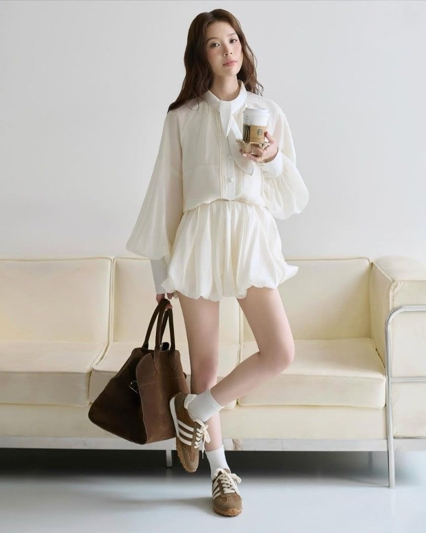 - Phai như sắc nằng cuối mùa khẽ nhạt dần trên vai áo, thiết kế cổ tròn và tay lửng nhẹ rủ, kết hợp cùng chân váy xếp nhún mềm mại, tạo nên tổng thể thanh thoát, nữ tính mà vẫn tinh tế.