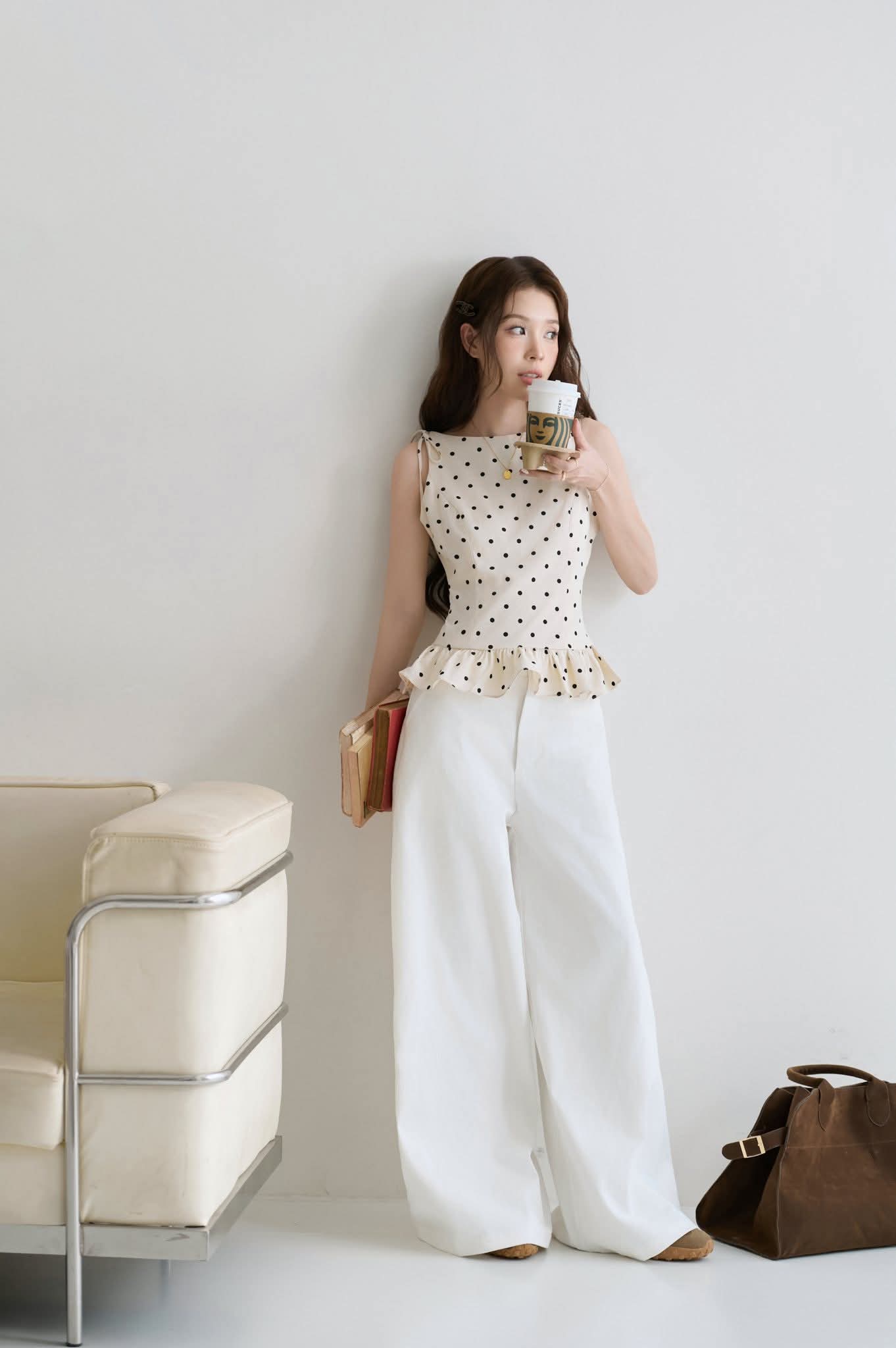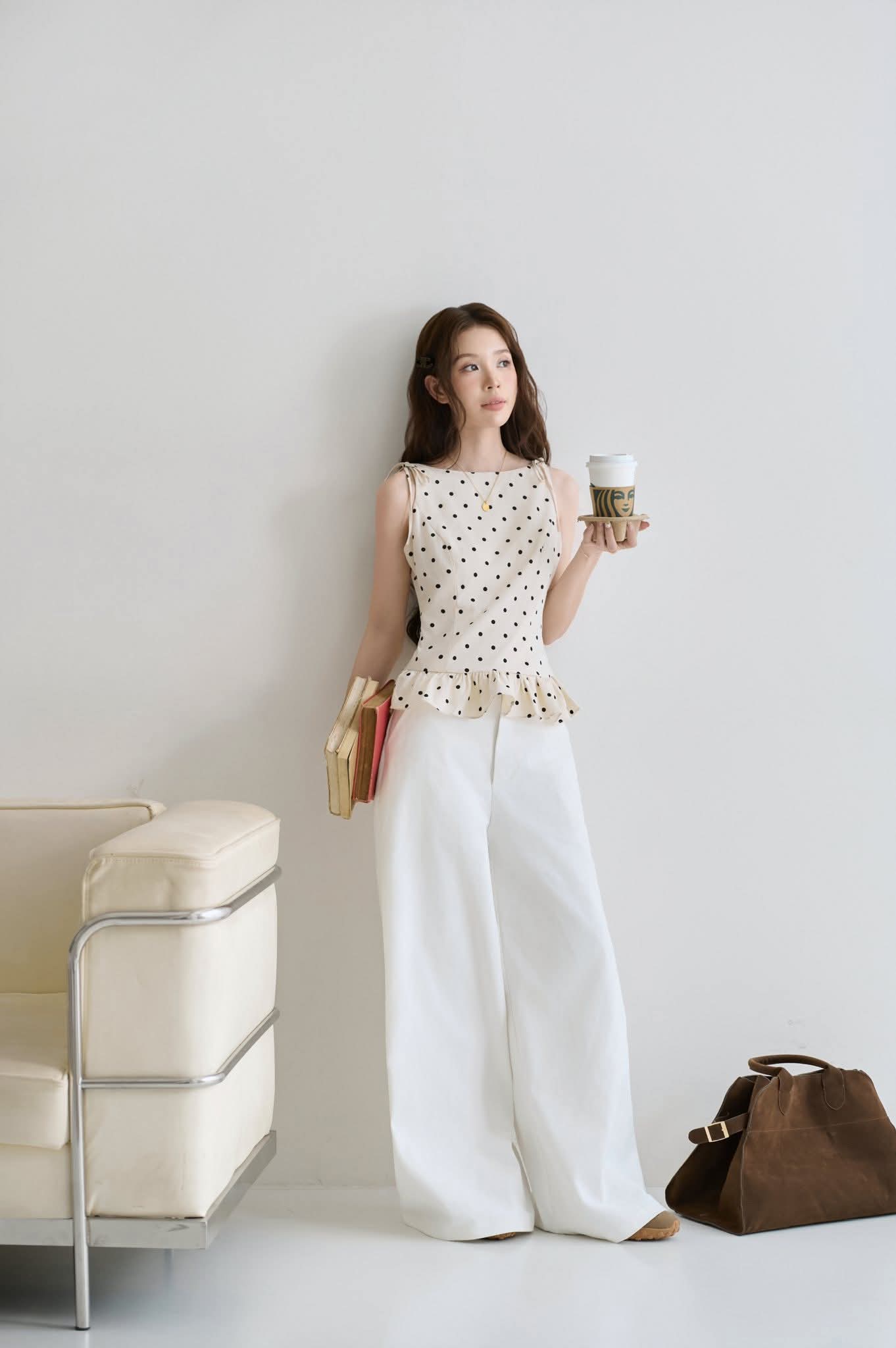 - Mang sắc thái tươi sáng và dịu dàng như ánh nắng đầu ngày, Nắng là bản hòa ca giữa sự nhẹ nhàng và tinh tế. Chiếc áo linen xước chấm bi với chi tiết peplum nhỏ khéo tôn dáng, kết hợp cùng quần kaki dày dáng suông tạo nên vẻ ngoài thanh thoát, hiện đại nhưng vẫn đầy nữ tính.
