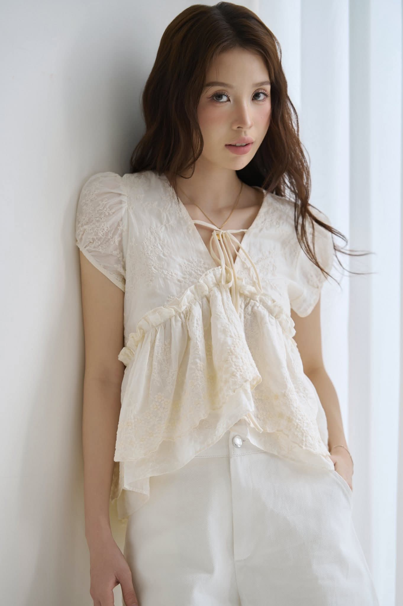 - Có những buổi sáng đầu thu, khi ánh nắng lướt nhẹ qua khung cửa sổ, gió khẽ đung đưa tán lá Phiêu ra đời từ những khoảnh khắc mong manh và trong trẻo như thế. Chiếc áo tơ thêu hoa nhẹ nhàng, bồng bềnh như áng mây, mang vẻ nữ tính rất đỗi tự nhiên. Phối cùng quần kaki trắng dày dặn.