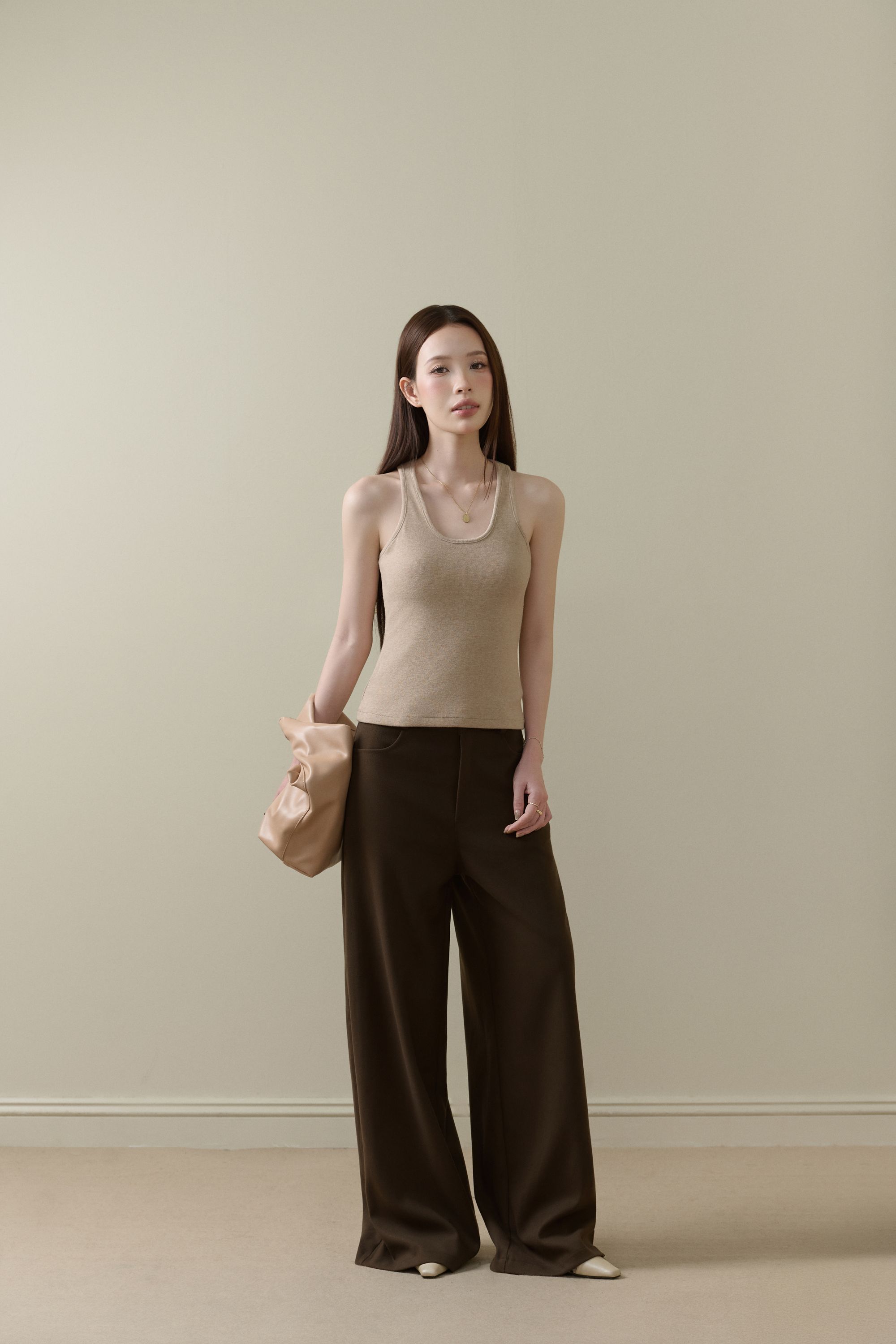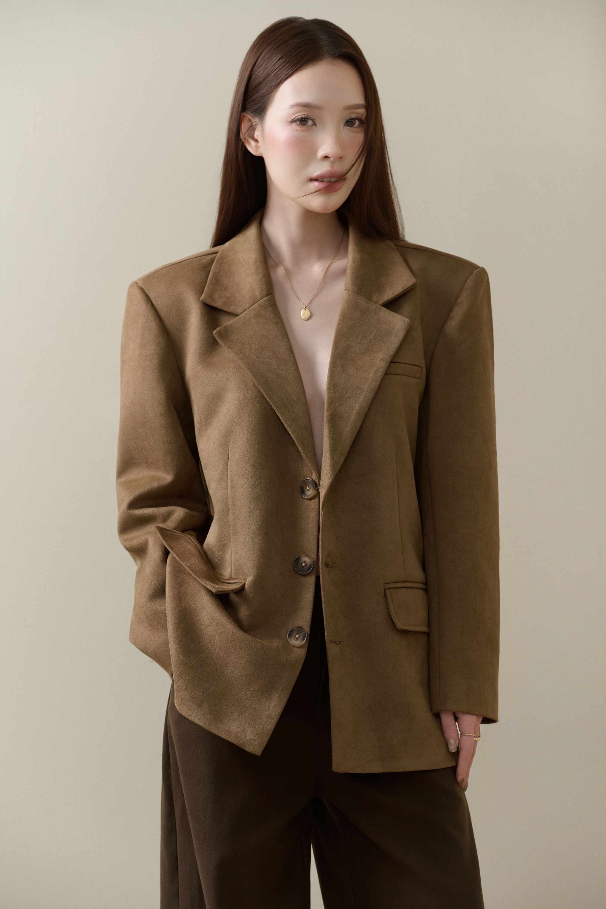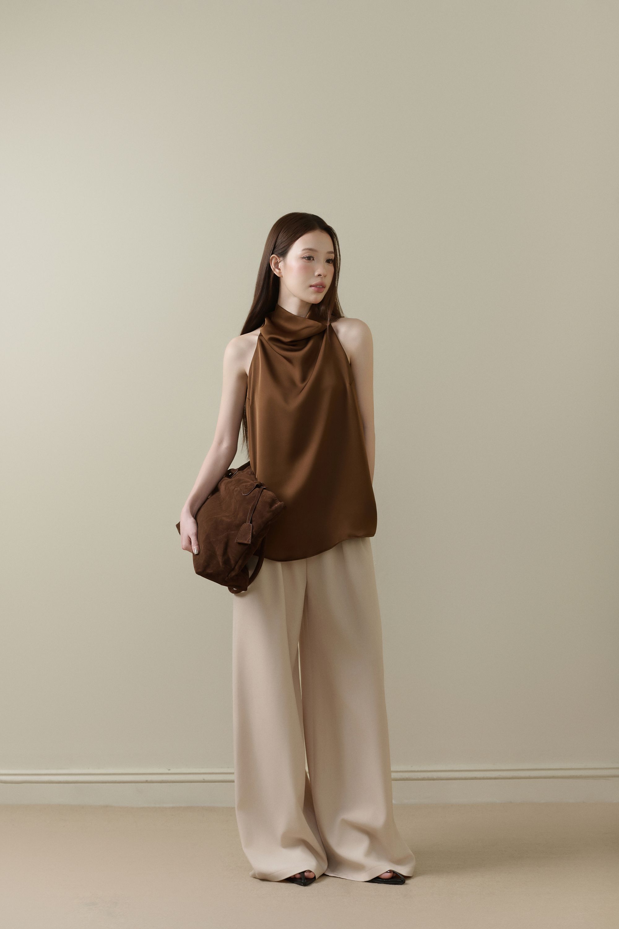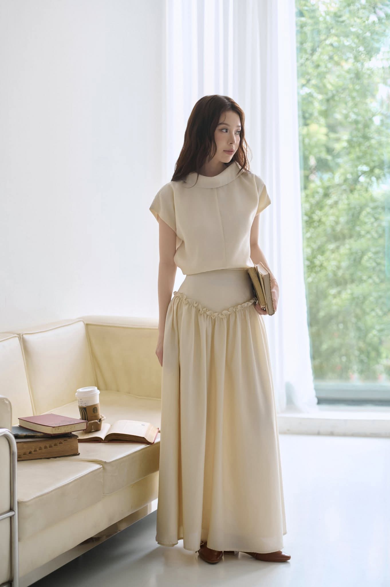 - Nhẹ như hơi thở của gió, Miên mang trong mình vẻ yên ả và sâu lắng của những ngày thu chậm rãi. Dáng áo tối giản với phần vai rộng, đường cắt thả tự nhiên tạo nên cảm giác mềm mại, tự do mà vẫn tinh tế. Chân váy dài suôn nhẹ, ôm theo dáng người, hòa cùng sắc be nâu ấm áp tựa nắng cuối mùa.