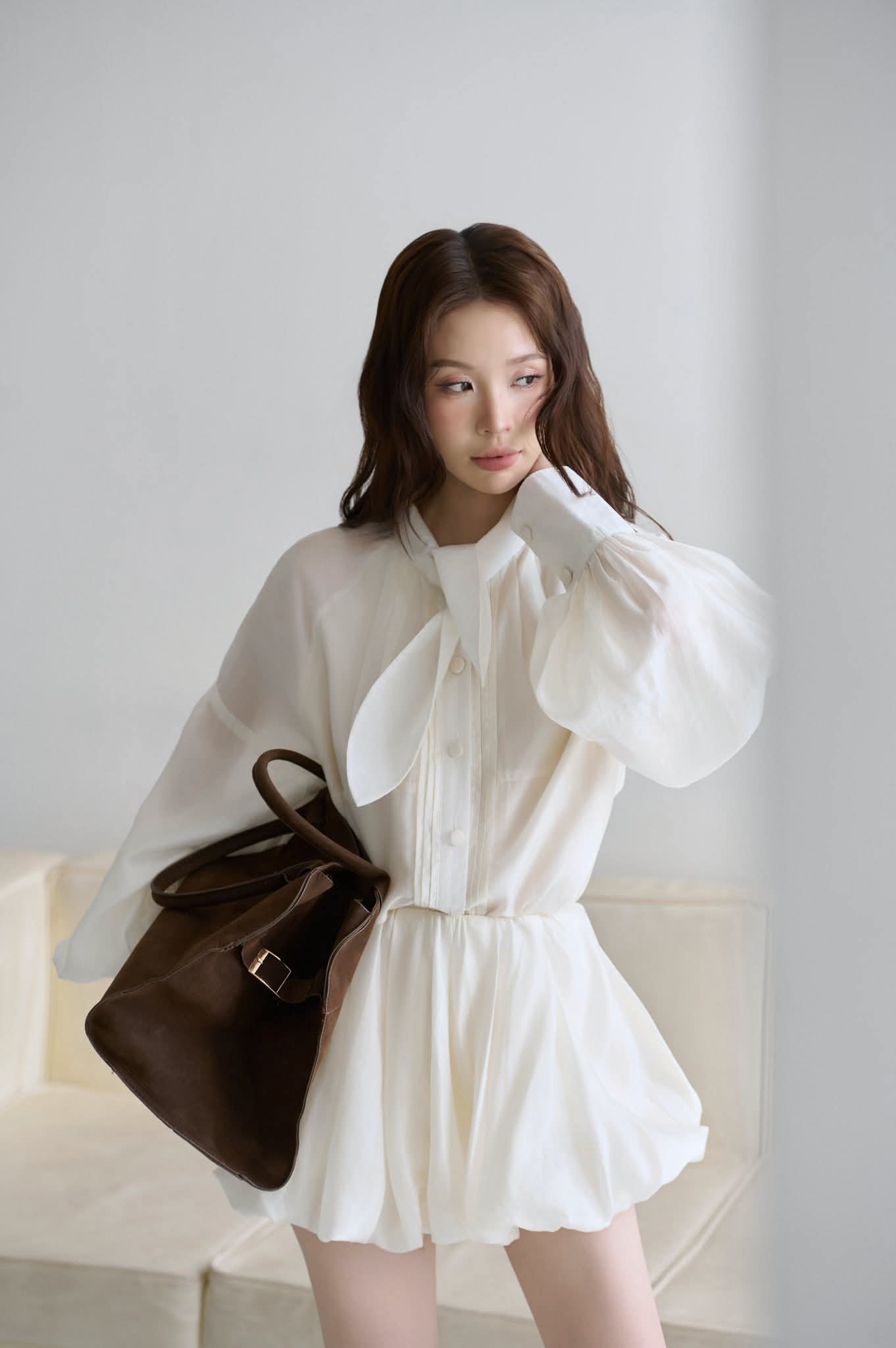 - Khói mang vẻ đẹp của sự tự do và tĩnh lặng. Lấy cảm hứng từ những buổi sáng bảng lảng sương, chiếc váy ra đời với dáng ngắn phồng nhẹ, tay dài buông rơi và cổ nơ mềm mại vừa trong trẻo vừa phóng khoáng. Chất liệu tơ Nhật dày hai lớp tạo nên độ rủ tự nhiên, giữ form tinh tế mà vẫn nhẹ nhàng trong từng chuyển động.