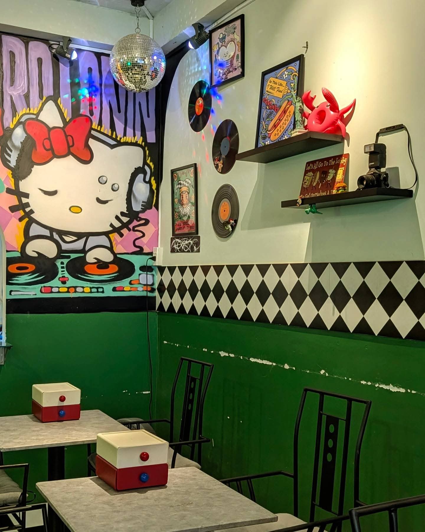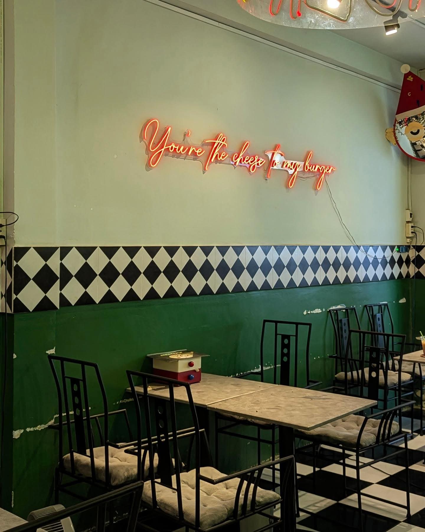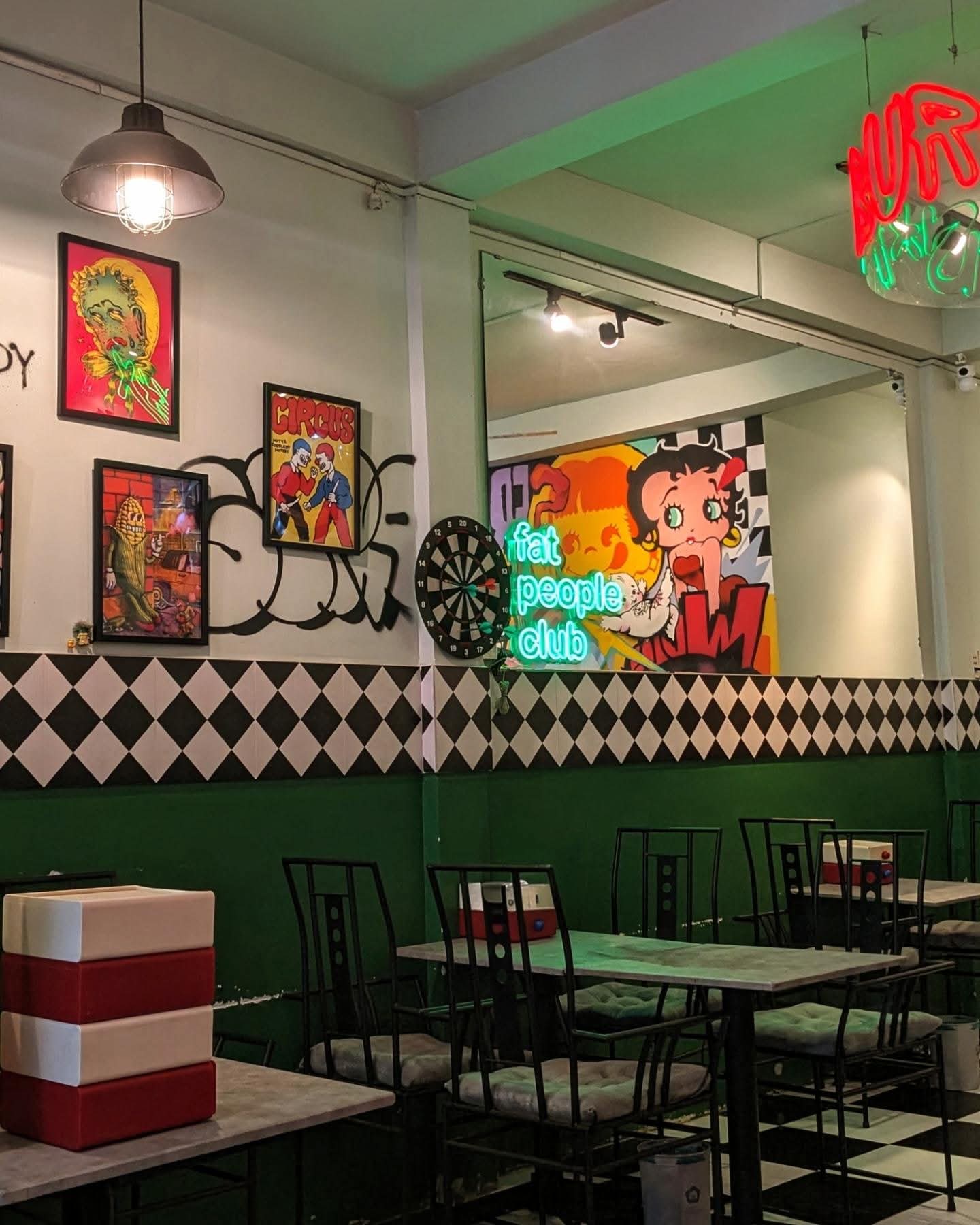 Serotonin có không gian nhỏ xinh mang đậm chất street culture, cá tính và sáng tạo – Quán sử dụng tông xanh đậm chủ đạo kết hợp sàn caro đen trắng cùng các bảng đèn neon nổi bật tạo nên một không gian vừa retro vừa hiện đại. Ngoài ra, Serotonin còn dùng tranh pop-art, poster hoạt hình và nhiều chi tiết décor thú vị khác.